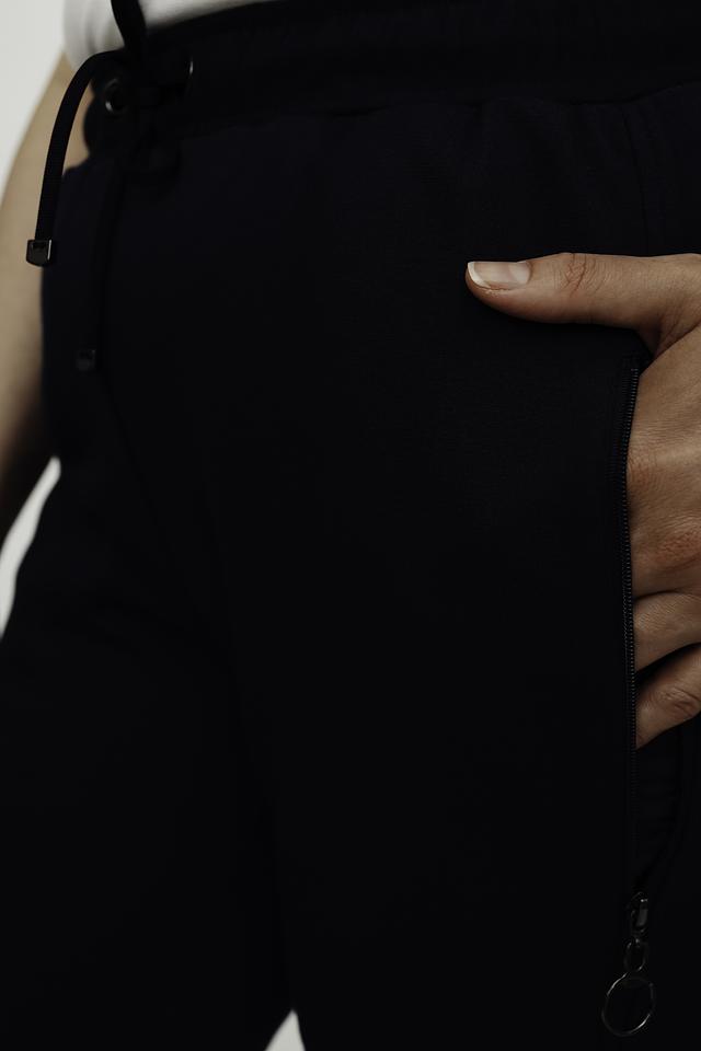 Брюки имеют прямой крой, зауженный к низу, что придает им современный и аккуратный вид. Эластичный пояс с регулируемой кулиской обеспечивает комфортную посадку по фигуре. По боковым швам расположены функциональные карманы.