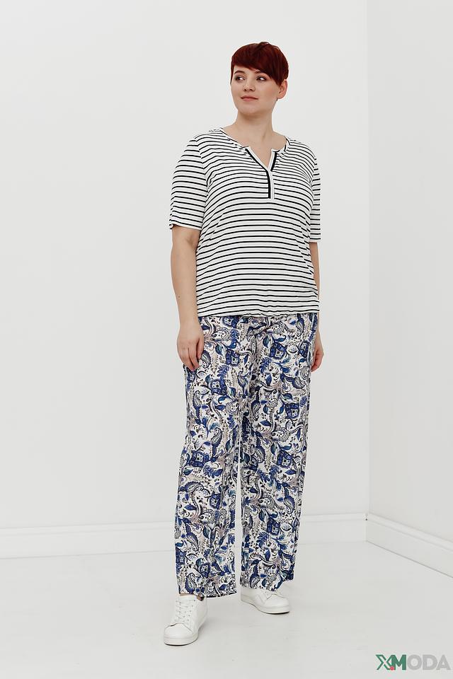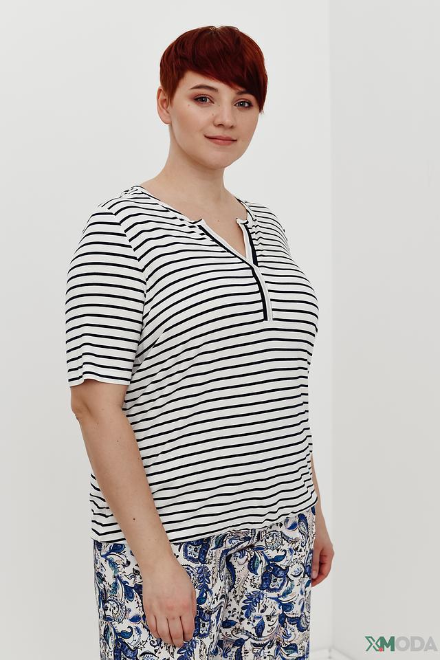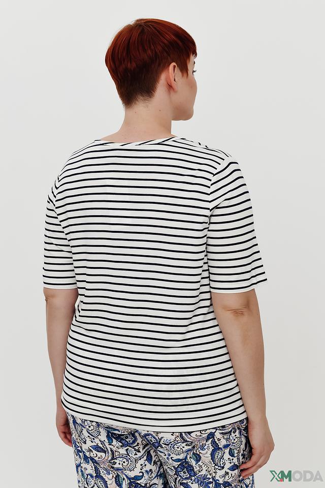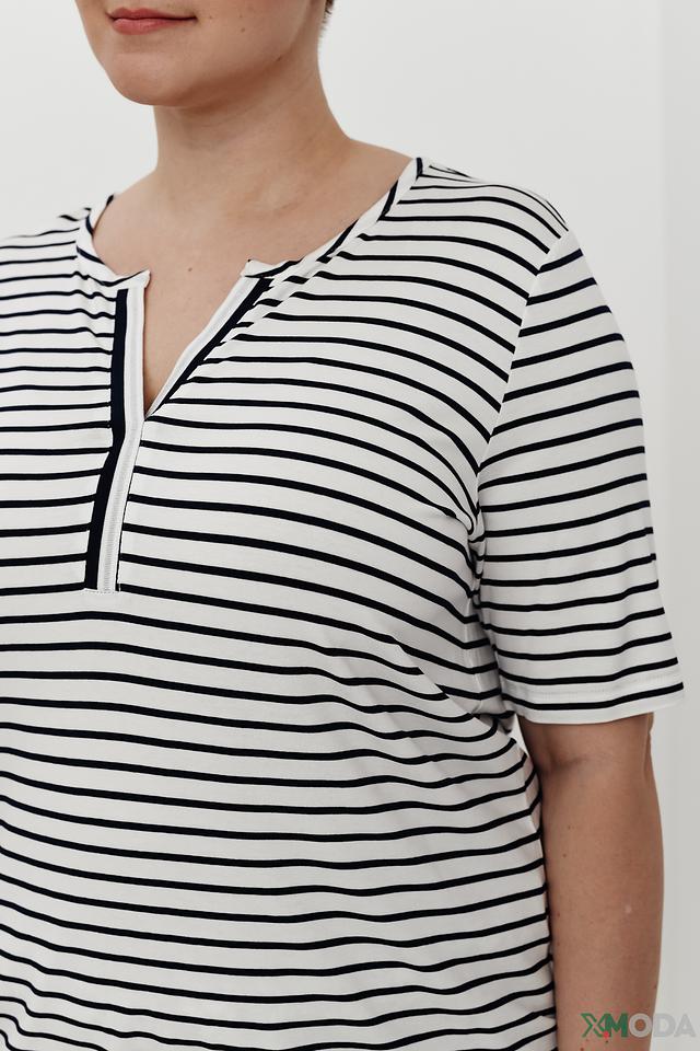 Блуза Frapp в бело-синюю полоску – стильная и комфортная модель из вискозы с эластаном. Удобный крой и V-образный вырез с декоративной вставкой делают эту блузу отличным выбором для повседневного гардероба. Состав: вискоза 94%, эластан 6%