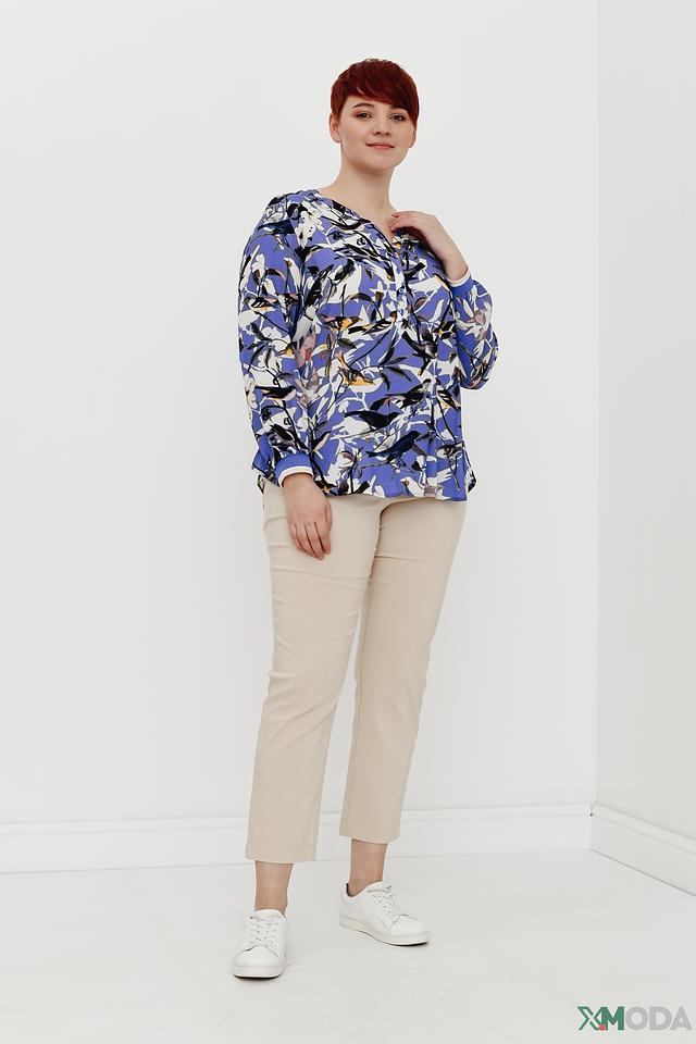 Блуза имеет V-образный вырез горловины, который подчеркивает женственность силуэта. Рукава длиной 3/4 с манжетами добавляют образу изысканности. Свободный крой обеспечивает удобство и позволяет легко сочетать блузу с различными предметами гардероба.