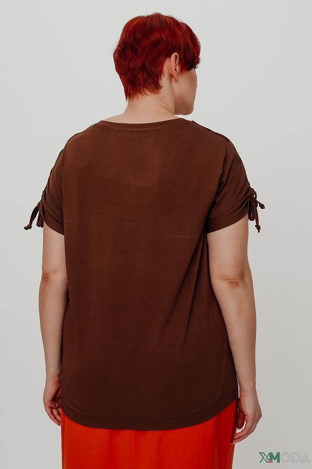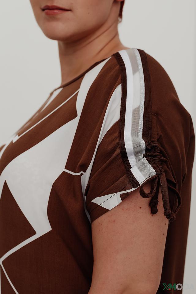 Блуза Frapp коричневого цвета с оригинальным геометрическим принтом станет стильным дополнением вашего гардероба. Модель выполнена из мягкой вискозы с добавлением эластана, обеспечивающего комфорт при носке. Завязки на рукавах добавляют образу изюминку. Состав: вискоза 90%, эластан 10%