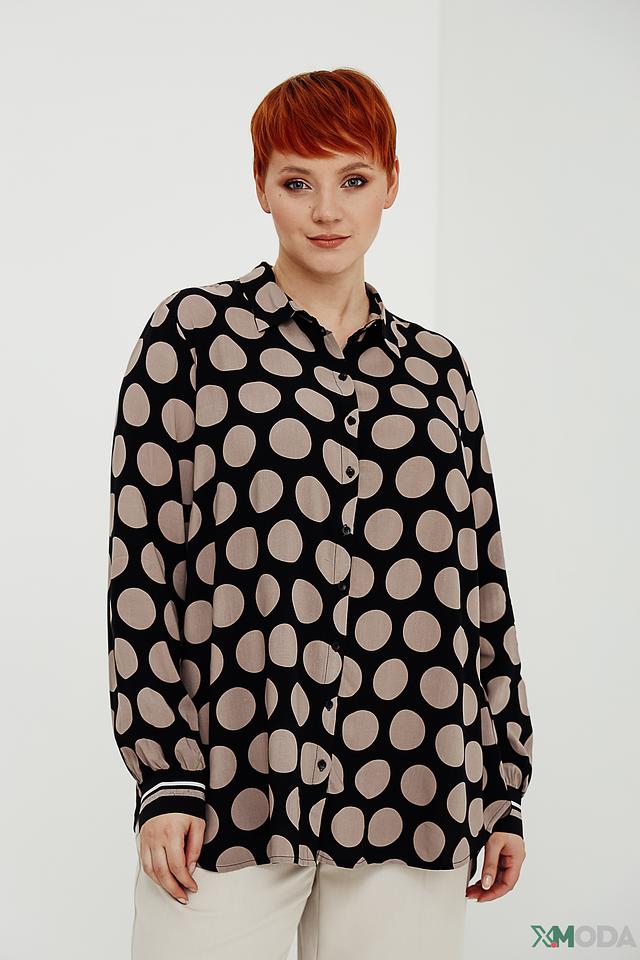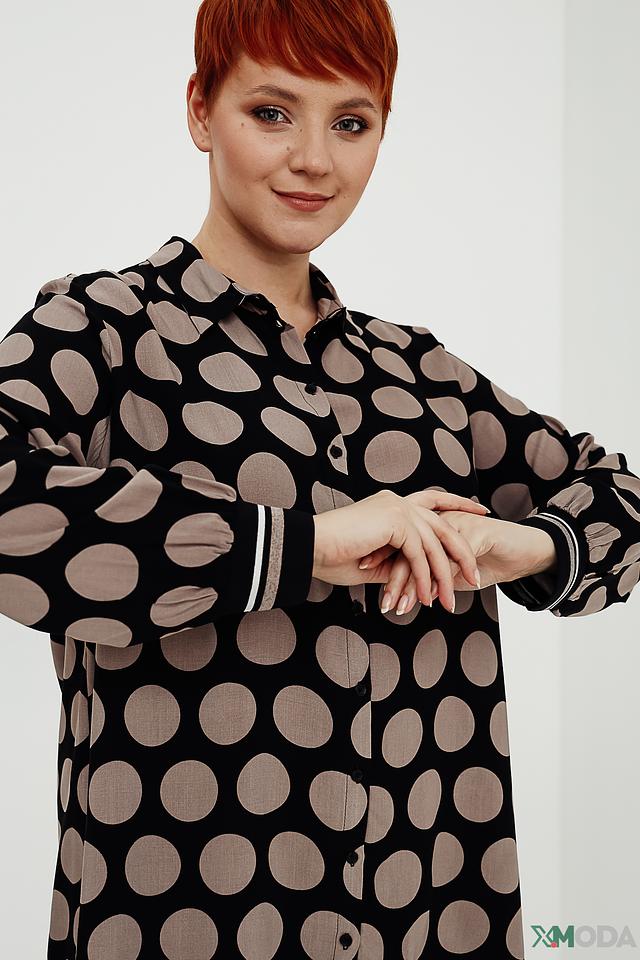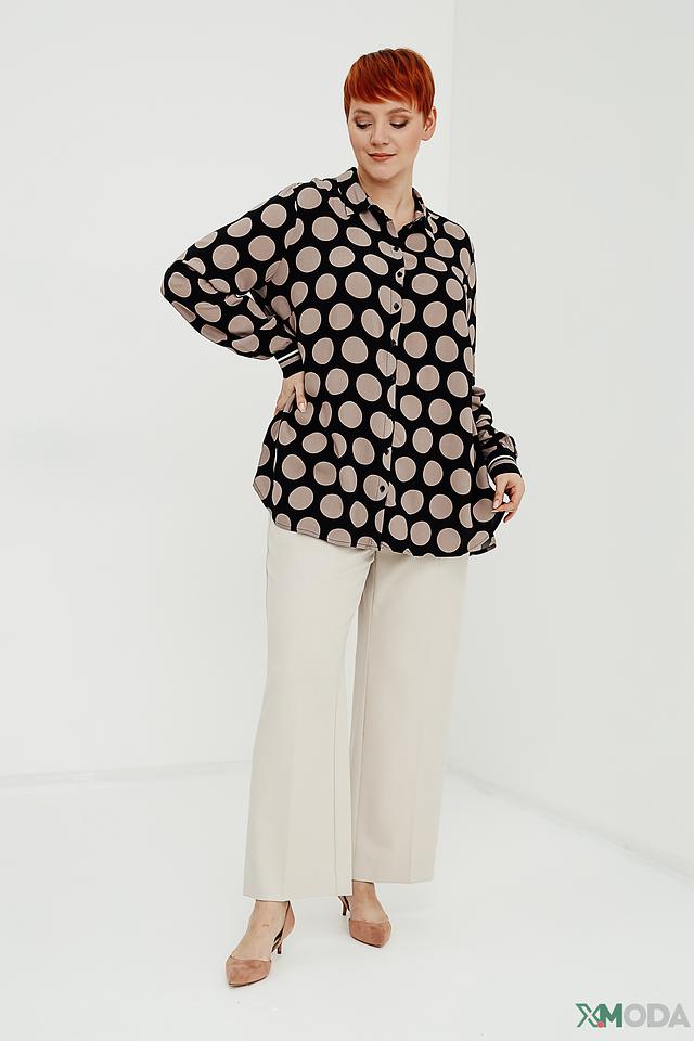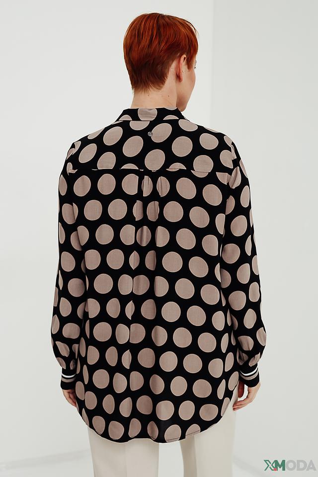 Рубашка имеет классический крой с длинными рукавами и отложным воротником. Её особенностью является принт в виде крупного бежевого горошка на чёрном фоне, который придает ей игривый и женственный вид. Манжеты рукавов отделаны контрастной полоской.