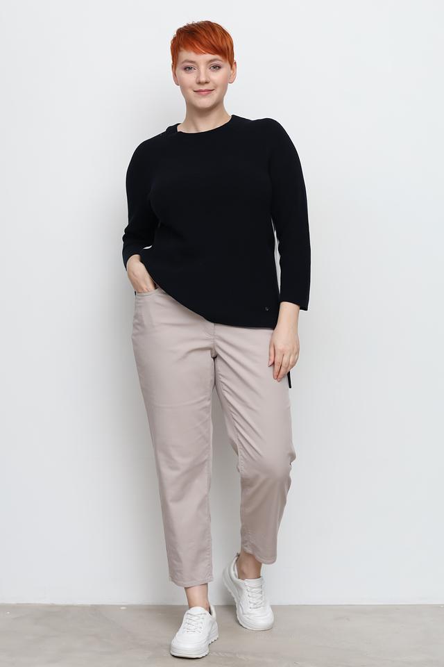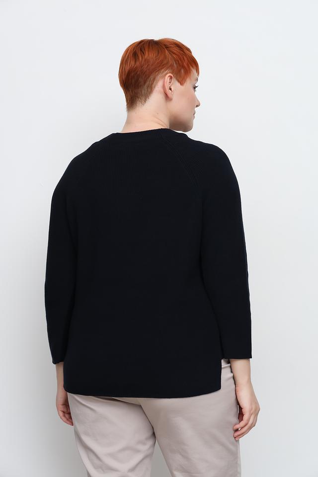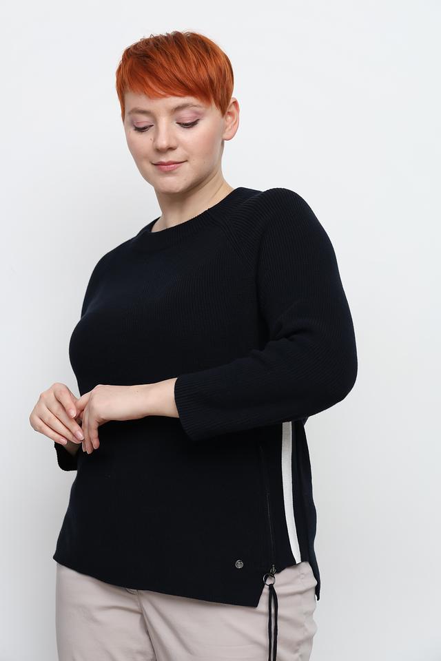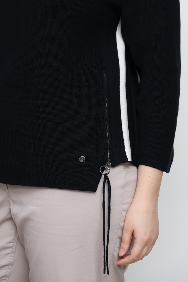 Пуловер имеет классический крой с круглым вырезом горловины и длинными рукавами. Особенностью модели является асимметричная молния сбоку, которая добавляет образу динамичности и оригинальности. Декоративная молния выполнена в белом цвете, что создает контрастный акцент.