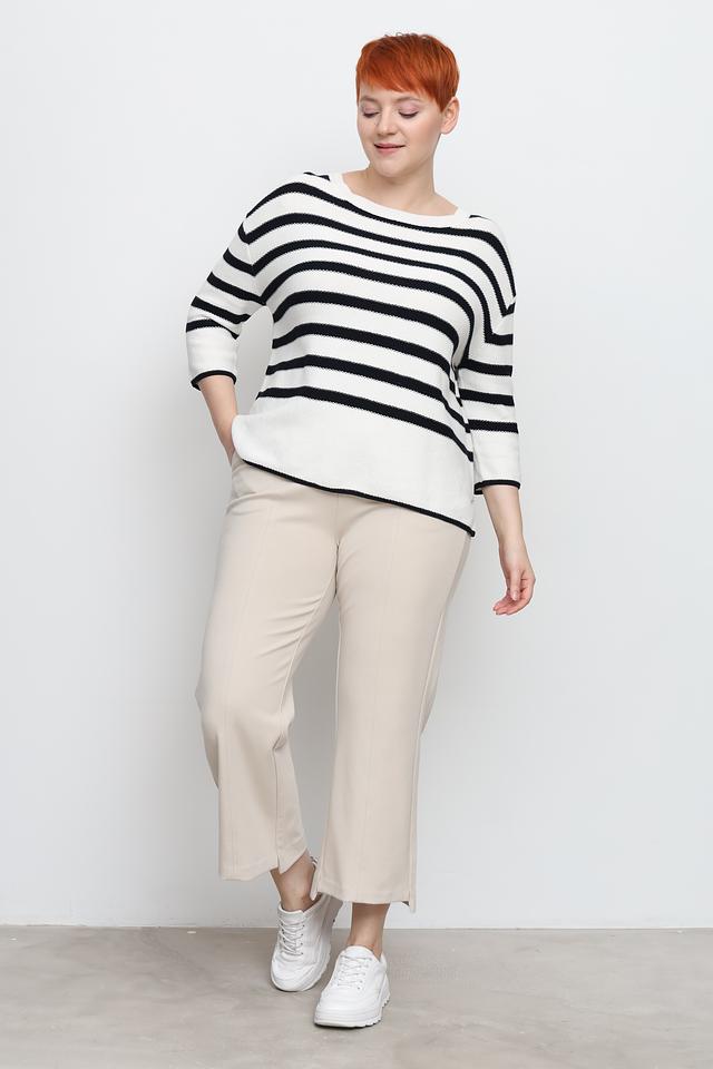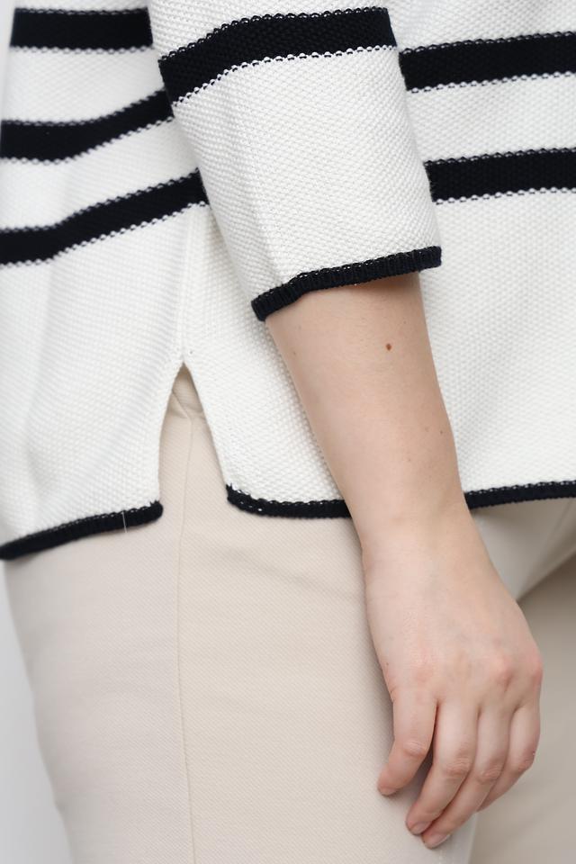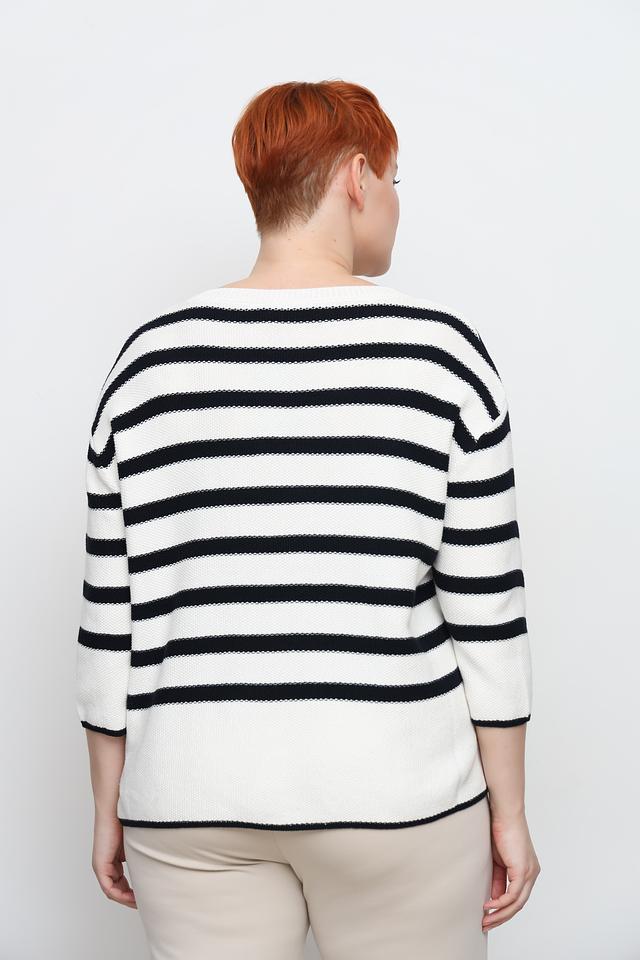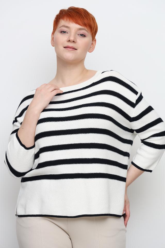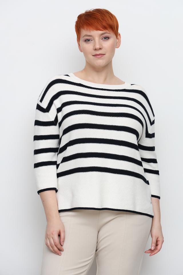 Женский пуловер Frapp белого и чёрного цвета с полосатым узором. Модель выполнена из мягкого хлопка, имеет удобный крой и рукава 3/4. Идеально подойдёт для создания повседневных образов. Состав: хлопок 100%