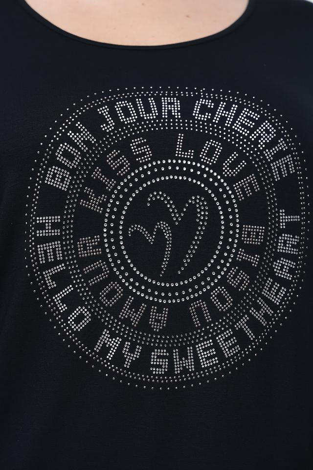 Основным украшением модели является крупный круглый принт, полностью выложенный мерцающими стразами. Принт выполнен в виде надписи на французском языке, что придает футболке особый шарм и изысканность.