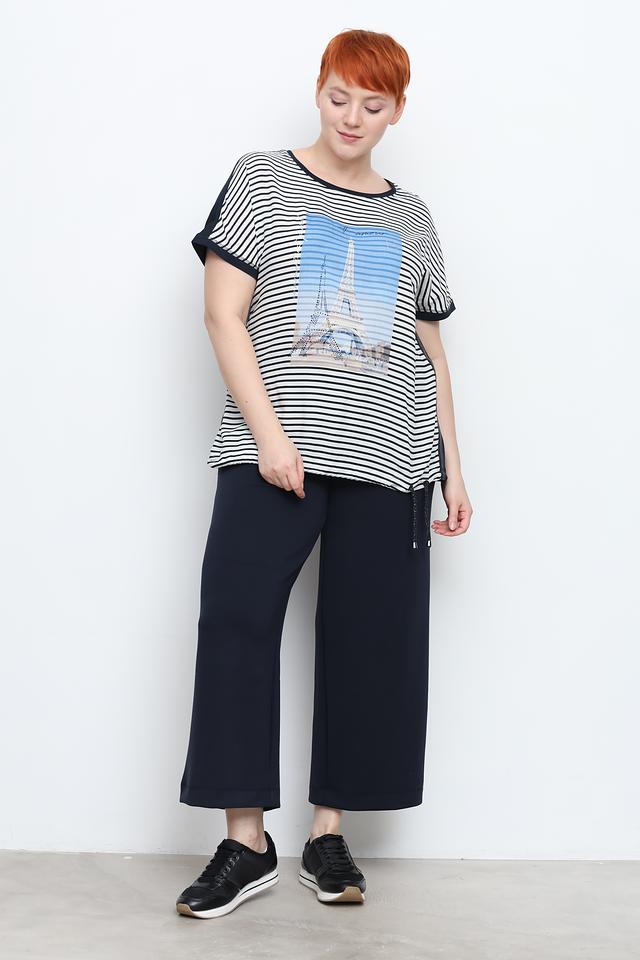 Футболка выполнена в классическую полоску – сочетание белого и черного цветов делает ее универсальной и легко сочетаемой с другой одеждой. Главная деталь – яркий принт с изображением Эйфелевой башни, который добавляет образу романтичности и французского шарма.