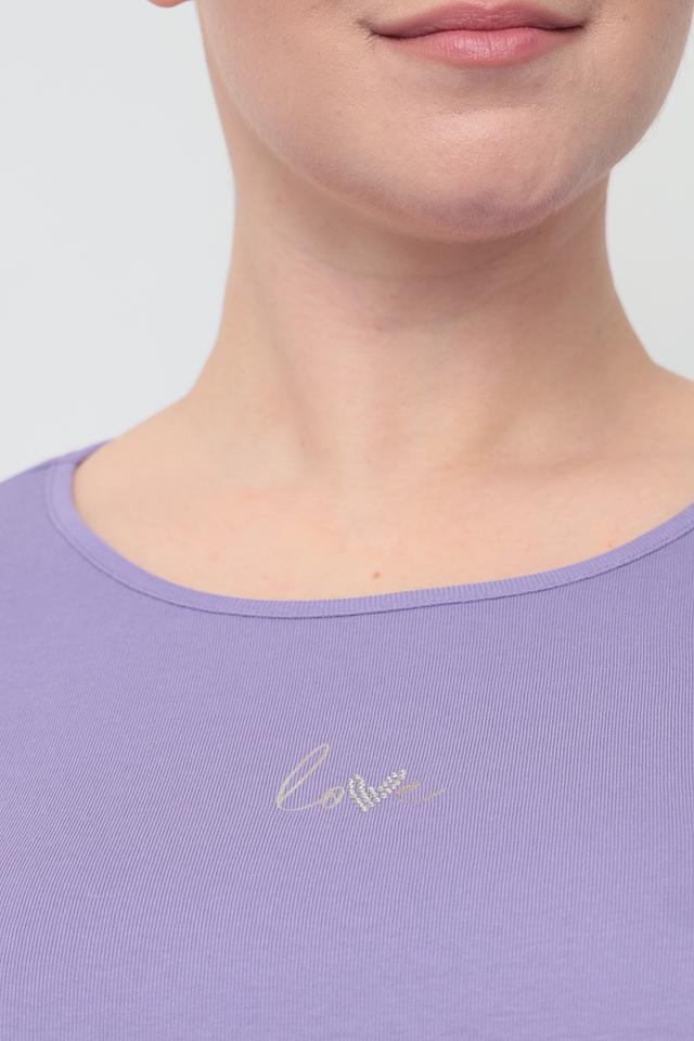 Футболка имеет лавандовый цвет и прямой крой, который подходит для любой фигуры. Короткий рукав делает ее идеальным выбором для теплой погоды. На груди присутствует небольшая вышивка с логотипом бренда, выполненная в тон изделия.