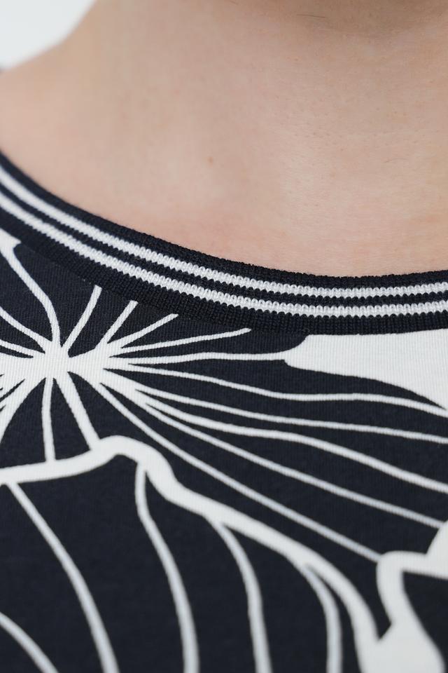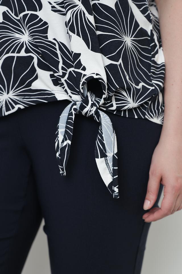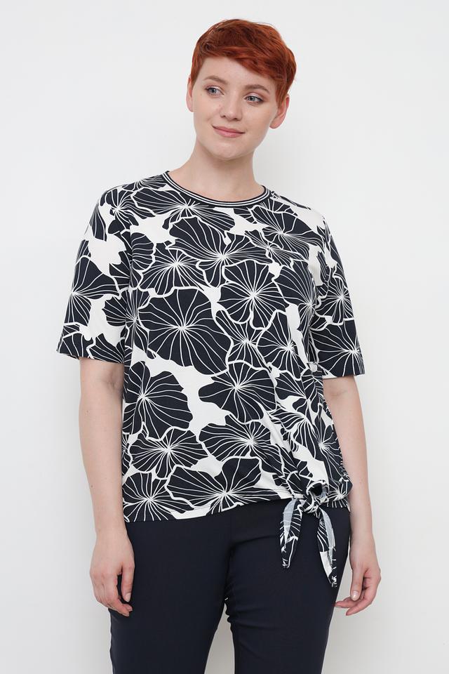 Блуза Frapp чёрно-белого цвета с оригинальным цветочным принтом и завязками по бокам. Изготовлена из мягкой и приятной к телу вискозы с добавлением эластана, обеспечивающего комфортную посадку. Состав: вискоза 90%, эластан 10%