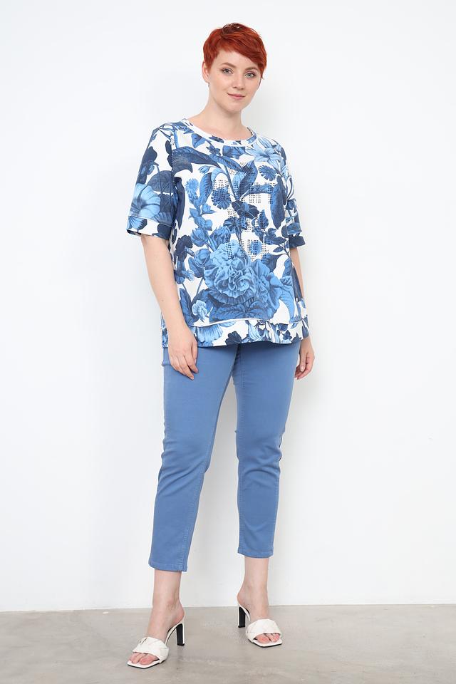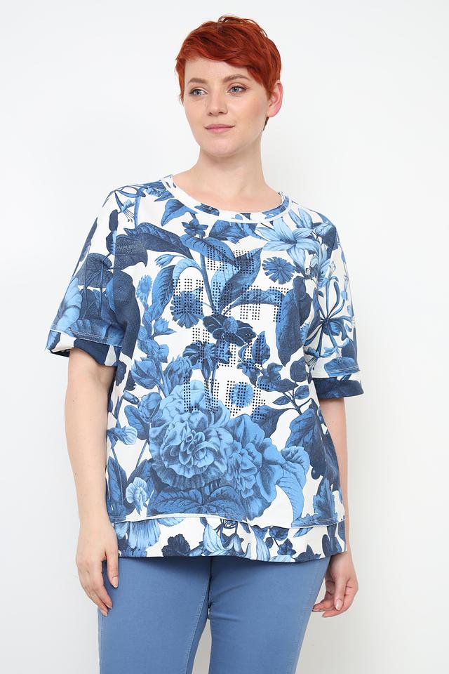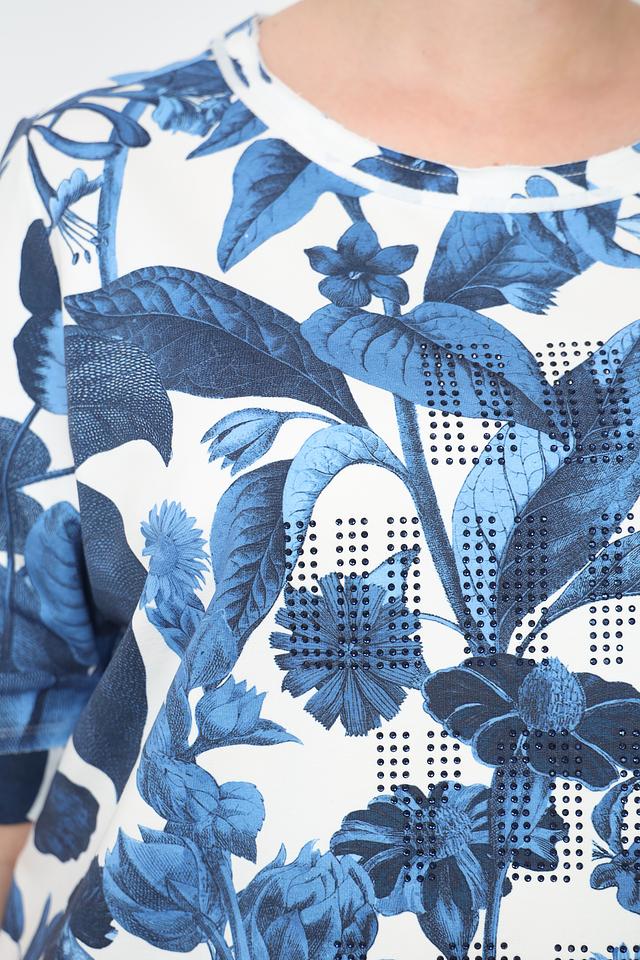 Женский пуловер Frapp синего цвета с ярким цветочным принтом станет стильным дополнением к вашему гардеробу. Модель выполнена из мягкого хлопка с добавлением эластана, обеспечивающего комфорт и свободу движений. Состав: хлопок 95%, эластан 5%