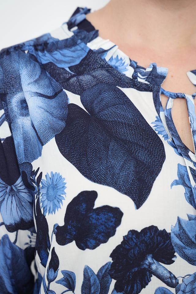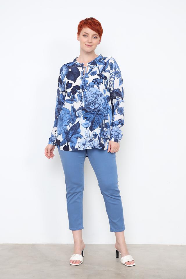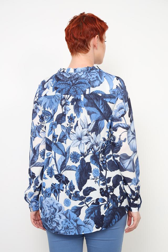 Эта стильная блуза от Frapp станет прекрасным выбором для создания элегантного и женственного образа. Блуза выполнена в нежном синем цвете и украшена ярким цветочным принтом, который придает ей особую привлекательность.