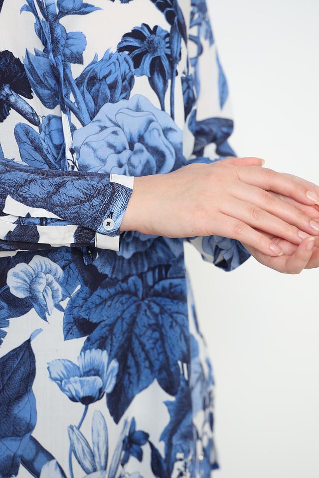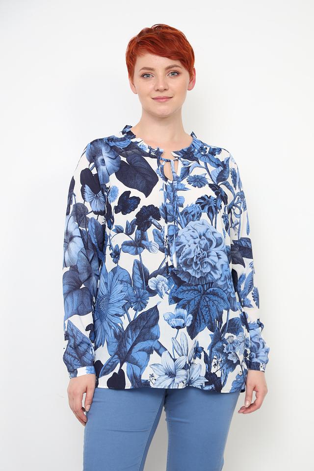 Блуза Frapp синего цвета с ярким цветочным принтом станет отличным дополнением к вашему гардеробу. Модель выполнена из мягкой вискозы, что обеспечивает комфорт в носке. Блуза имеет длинные рукава и V-образный вырез с завязками. Состав: вискоза 100%
