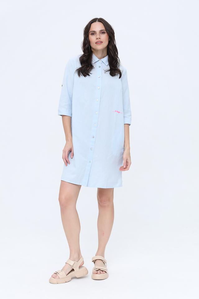Голубое платье-рубашка от Frieda and Freddies выполнено из льна с хлопком, имеет прямой крой и застёжку на пуговицы. Модель дополнена вышивкой на спине и рукавами 3/4. Состав: лен 65%, хлопок 35%