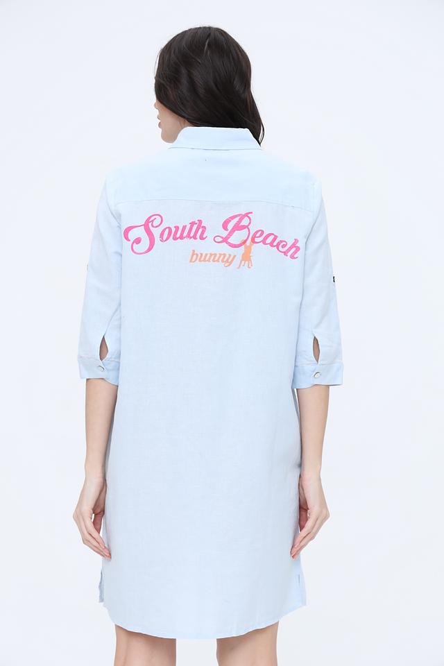 Платье имеет прямой силуэт, воротник рубашечного типа и застёжку на пуговицы по всей длине. Рукава длиной 3/4 с манжетами. На спине выполнена яркая вышивка с надписью "South Beach bunny" и изображением пальмы, что добавляет образу оригинальности.