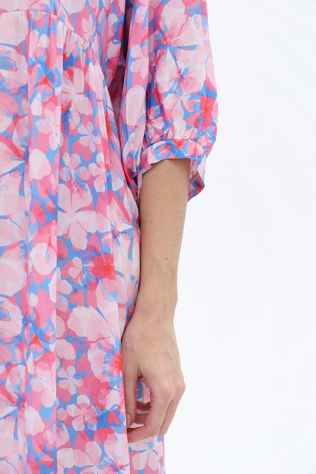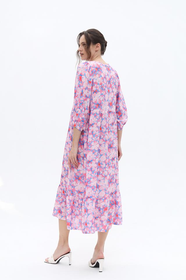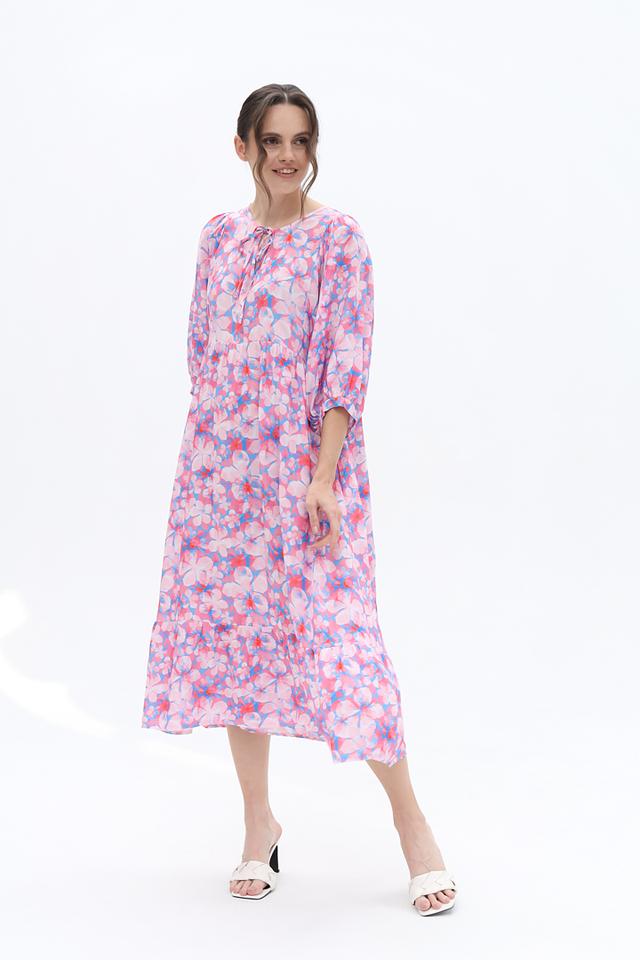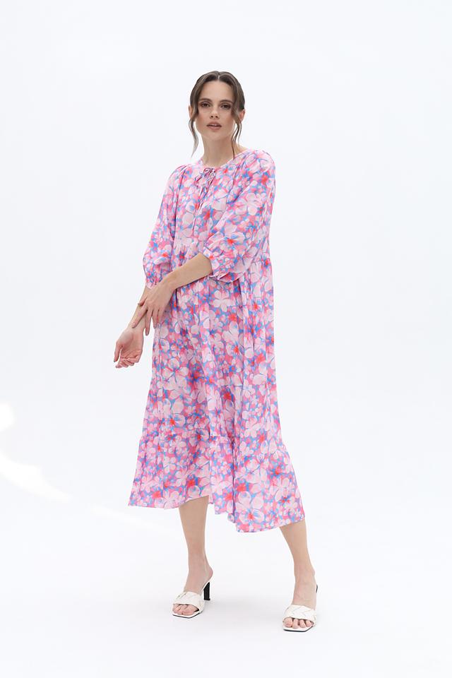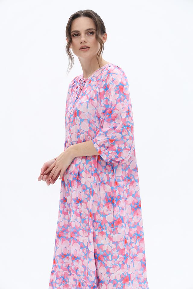 Это платье от Frieda and Freddies выполнено из 100% вискозы, что делает его приятным на ощупь и комфортным в носке. Преобладающий цвет – нежно-розовый, дополненный ярким цветочным принтом, состоящим из розовых, голубых и красных оттенков.
