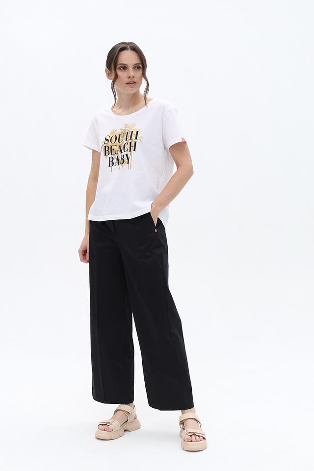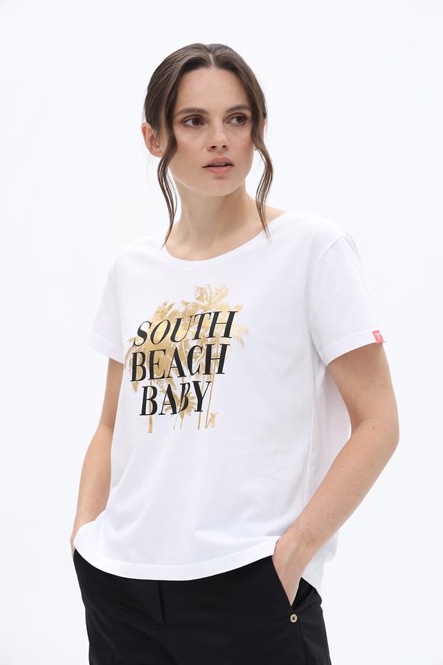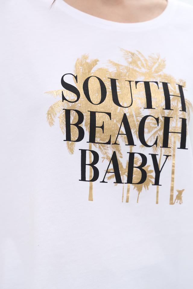 Основным акцентом модели является яркий золотистый принт с надписью "South Beach Baby" и изображением пальмовых листьев. Принт выполнен в технике, имитирующей эффект потертости, что придает футболке винтажный вид.