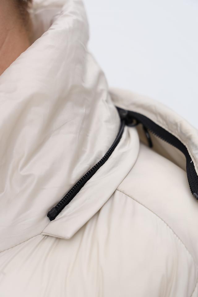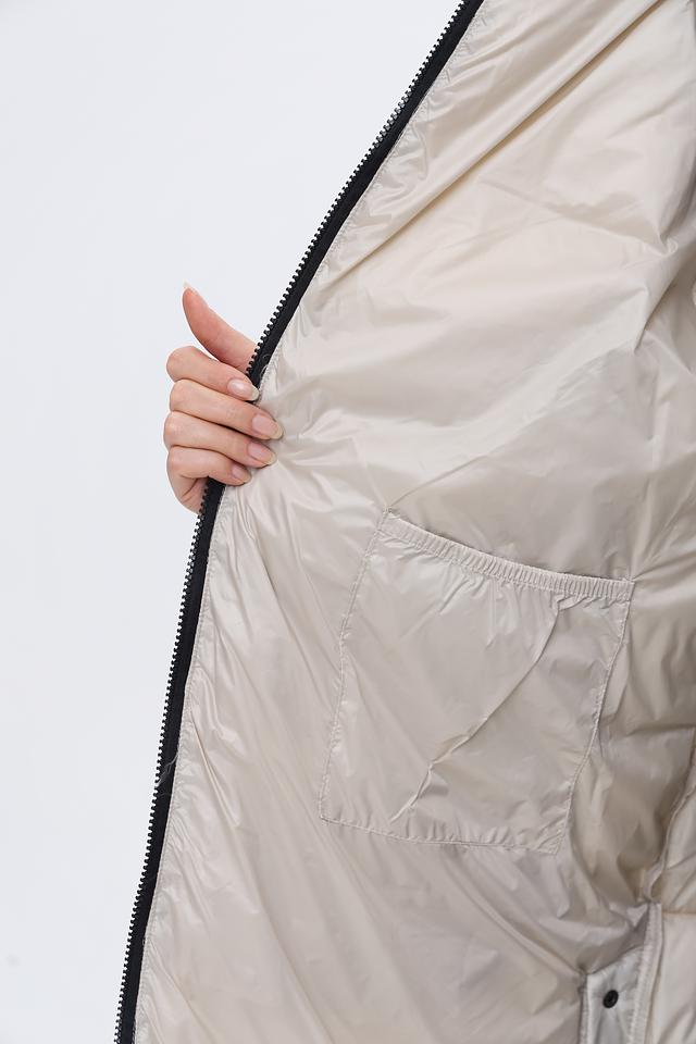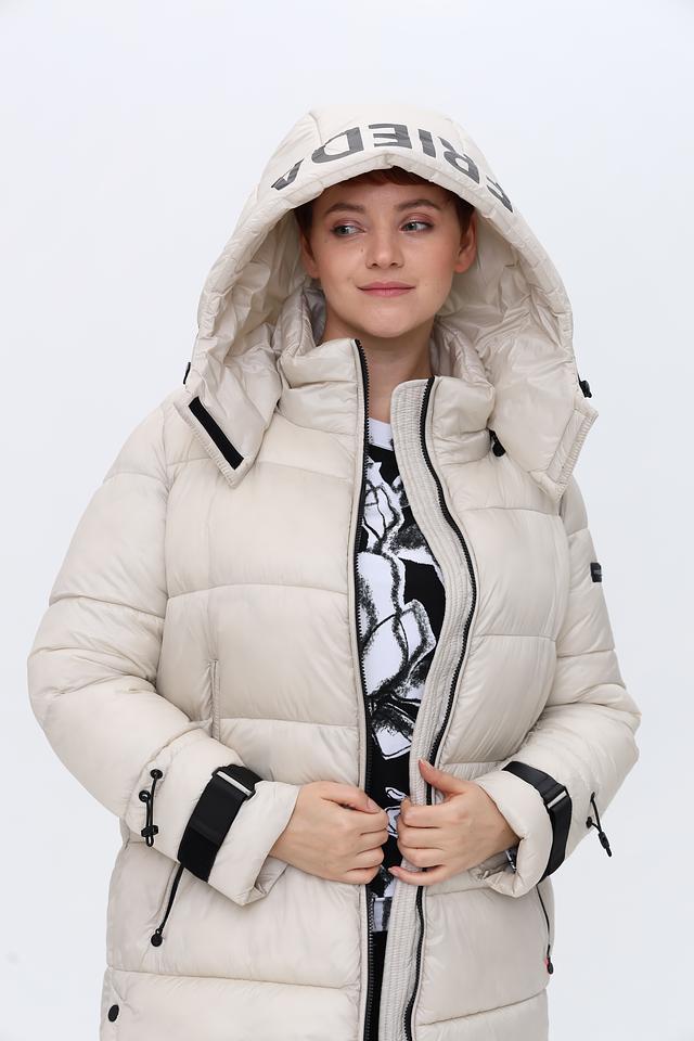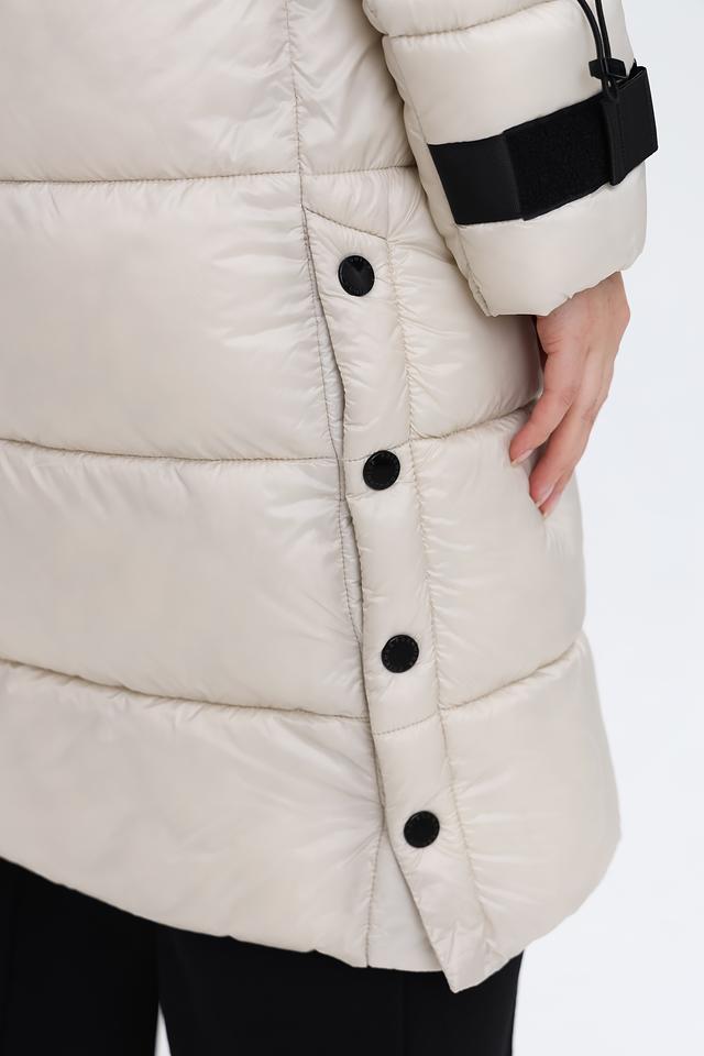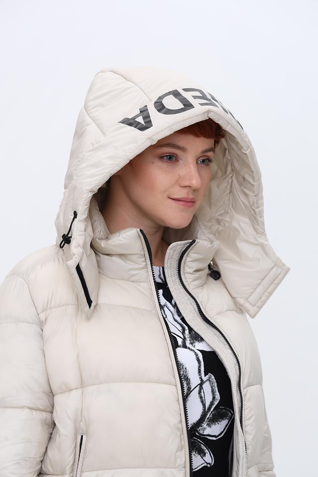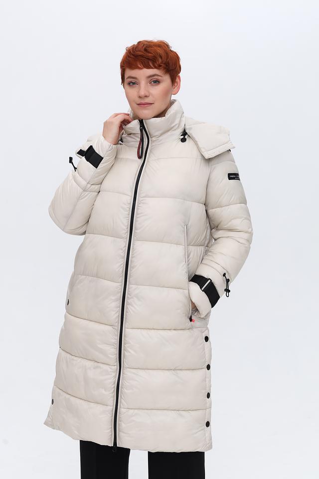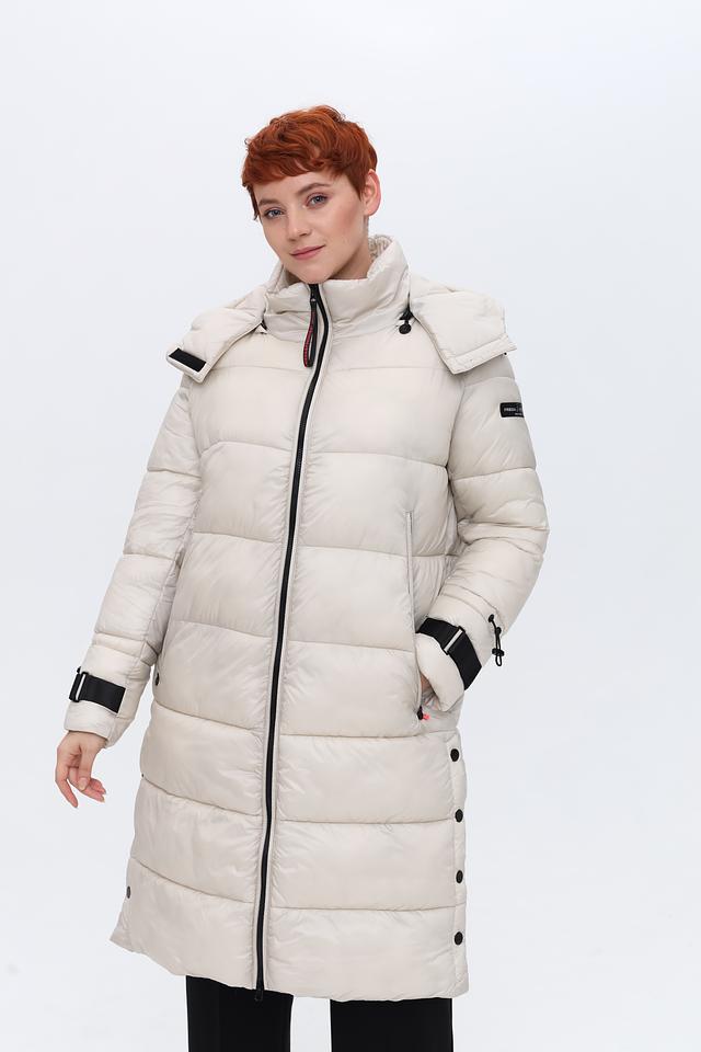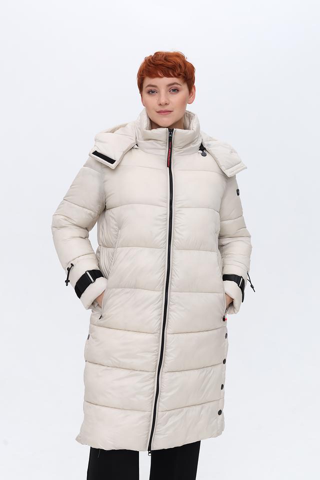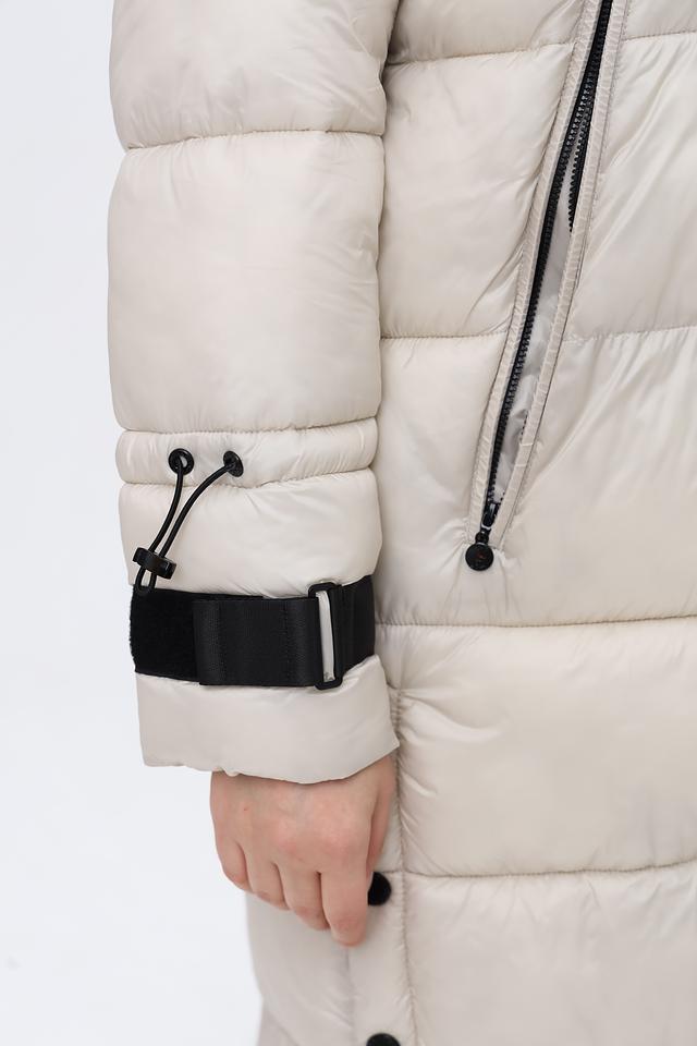Пальто имеет удлиненный крой, который обеспечивает дополнительное тепло и защиту от непогоды. Высокий воротник-стойка и капюшон защищают от ветра и холода. Застежка – молния, дополненная кнопками по всей длине изделия.