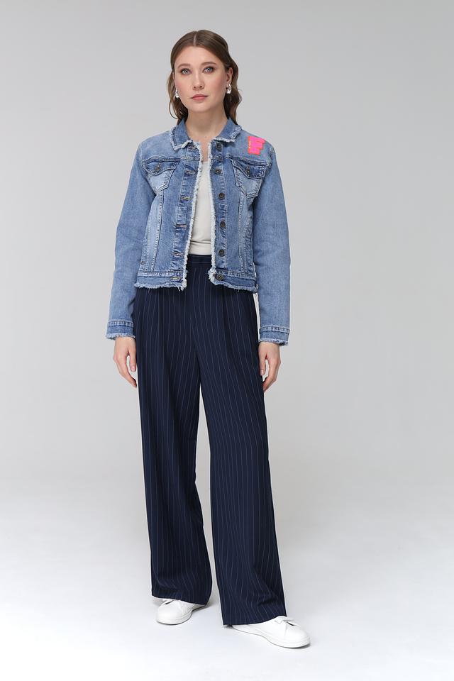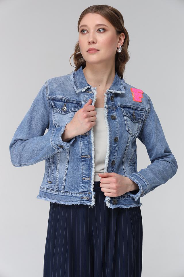 Куртка имеет классический джинсовый цвет и украшена яркой розовой нашивкой с логотипом бренда, что делает ее более оригинальной и привлекательной. Особенности кроя включают слегка укороченную длину и свободный силуэт.