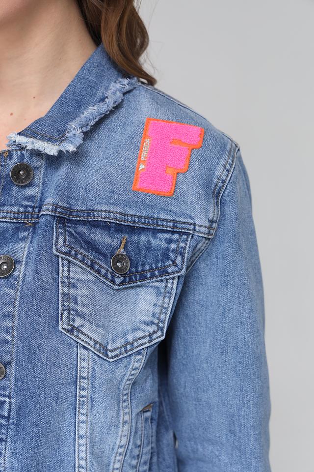 Джинсовая куртка Frieda and Freddies голубого цвета с яркой розовой нашивкой – стильный выбор для создания повседневных образов. Куртка имеет слегка укороченный крой и эффект потертости, что придает ей винтажный вид. Состав: хлопок 98%, эластан 2%
