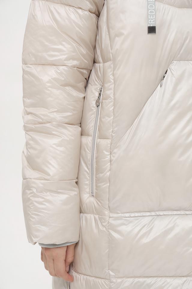 Пальто застегивается на молнию, имеет два функциональных кармана и декоративные элементы в виде логотипа бренда и контрастной окантовки.