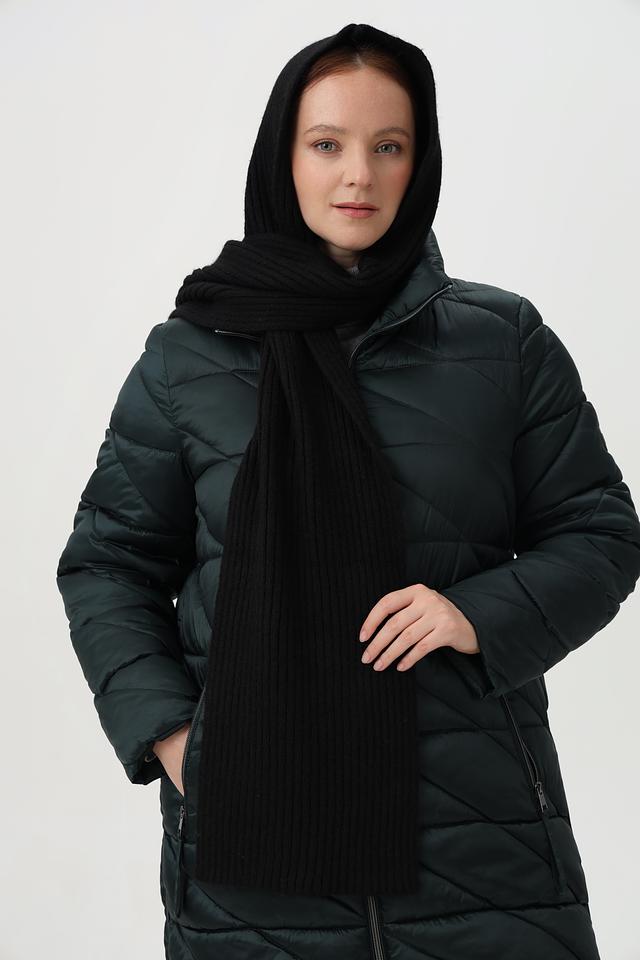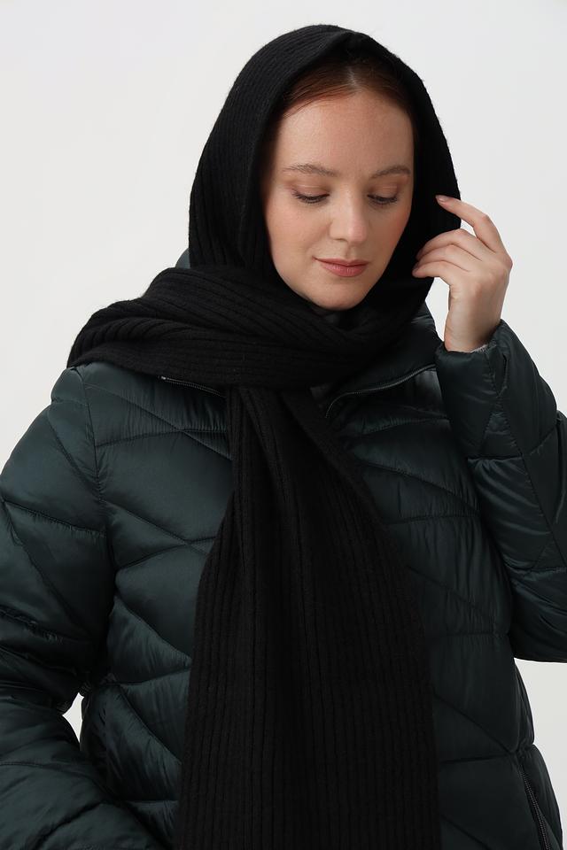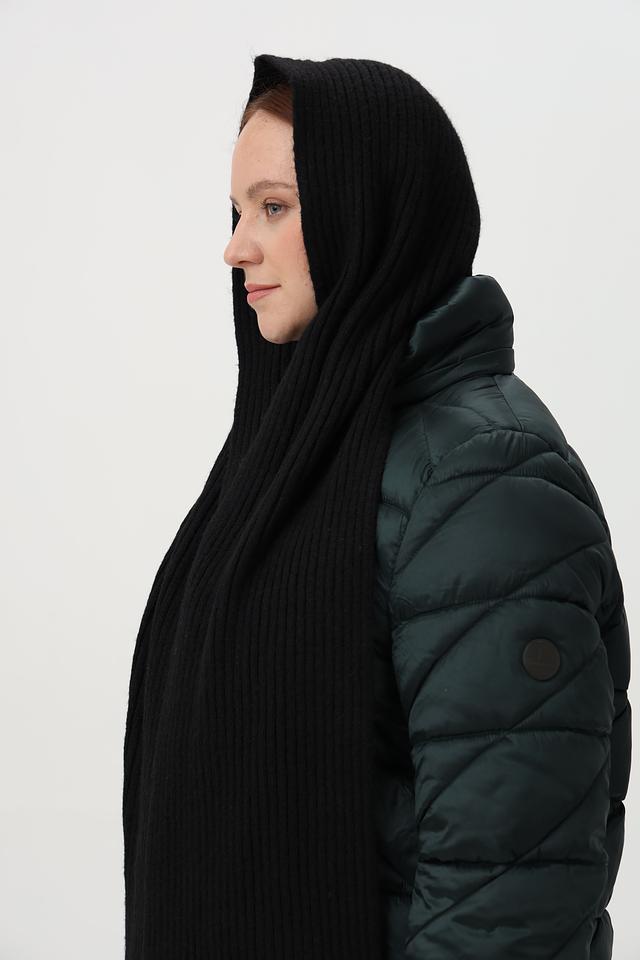 Шарф выполнен в классическом чёрном цвете, который легко сочетается с любой одеждой. Текстура изделия выполнена в виде крупной вязки, что придает ему объем и фактурность. Благодаря своему размеру, шарф можно носить различными способами – как обычный шарф, капюшон или даже шаль.