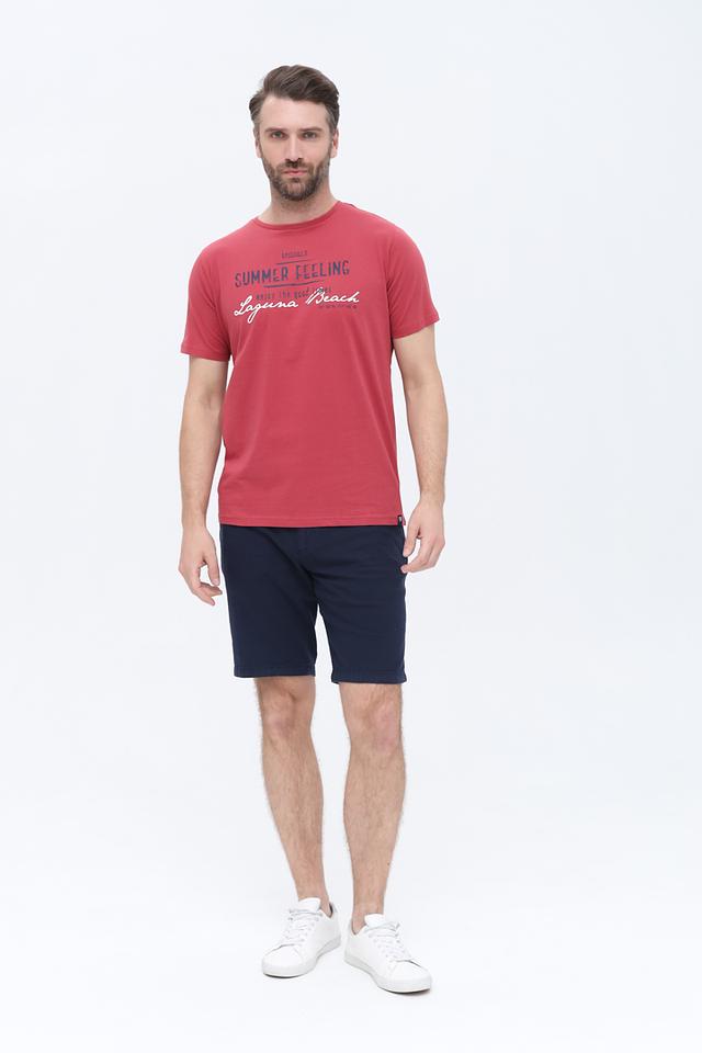 Основной цвет футболки – терракотовый, который придает ей стильный и современный вид. На передней части футболки расположен яркий принт "Summer Feeling" с надписью "Laguna Beach" и указанием координат, выполненный в белом и темно-синем цветах.