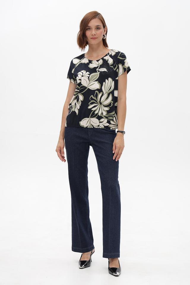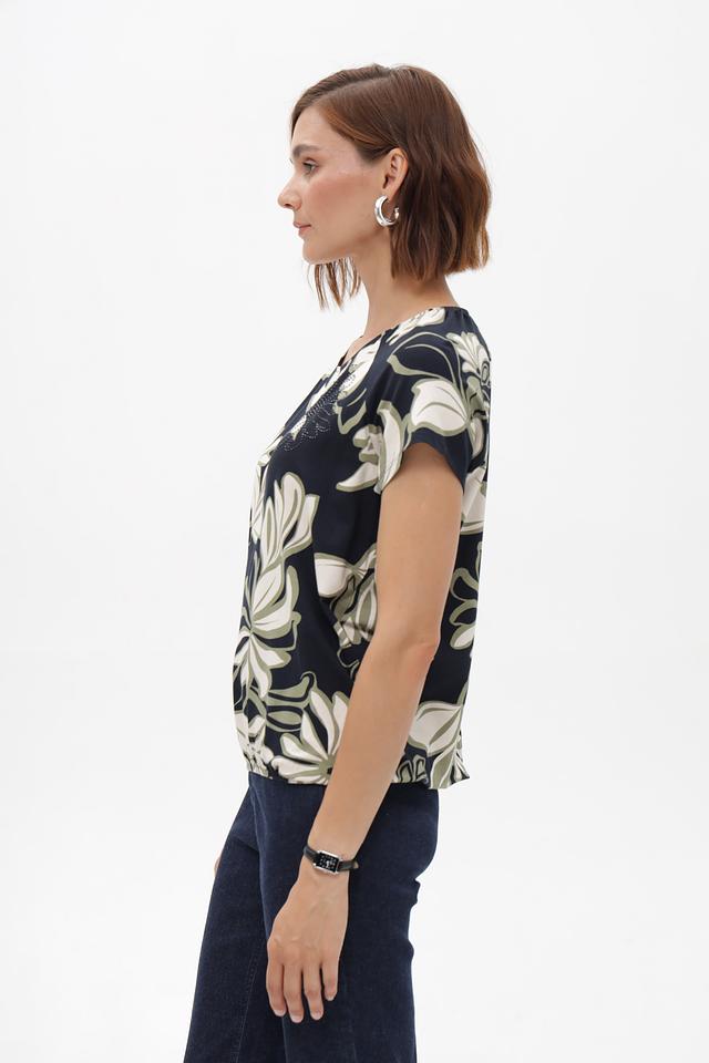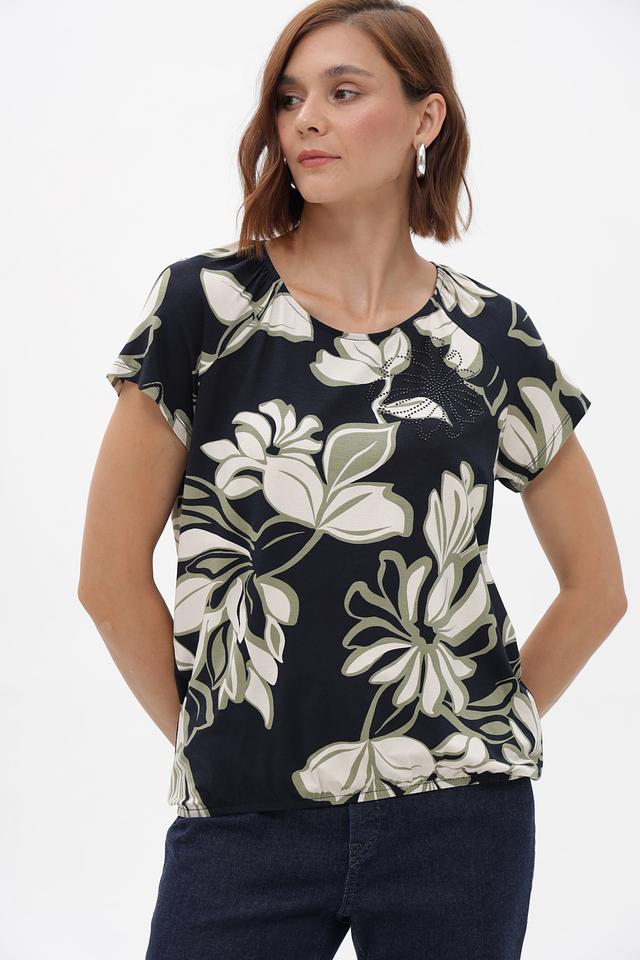 Модель имеет свободный крой, который не сковывает движения, и короткий рукав. Особое внимание привлекает яркий цветочный принт, выполненный в синих, зелёных и бежевых тонах. Небольшой декоративный элемент у горловины добавляет изысканности.