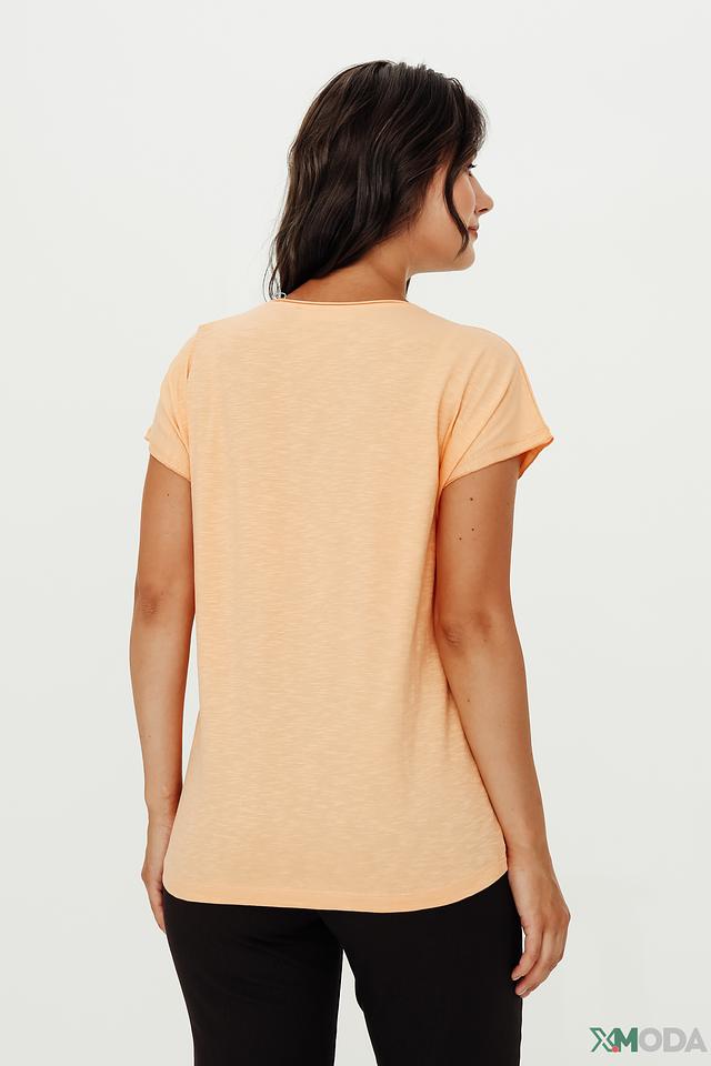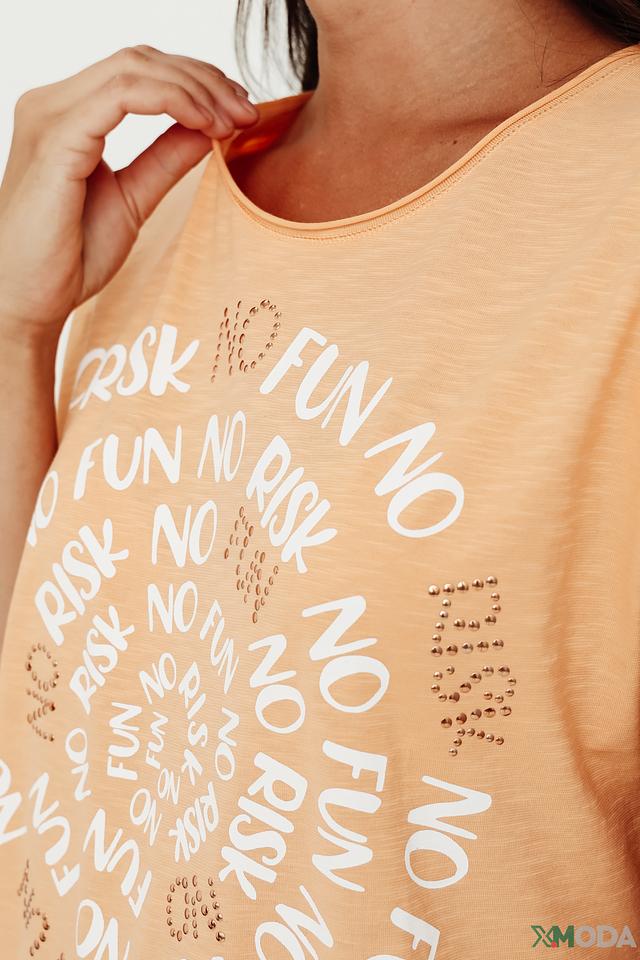 Эта стильная футболка от Bianca выполнена в нежном персиковом цвете и украшена эффектным принтом "No Risk No Fun". Футболка имеет свободный крой, который обеспечивает комфорт и свободу движений.