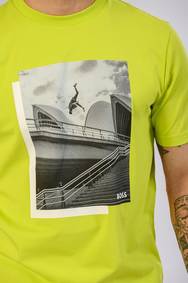 Мужская футболка Boss Green лаймового цвета с эффектным графическим принтом. Изготовлена из мягкого хлопка с добавлением эластана для комфорта и свободы движений. Стильный и современный выбор для повседневного образа. Состав: хлопок 95%, эластан 5%