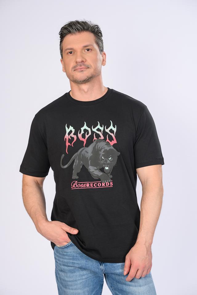 Основным элементом дизайна является крупный, детализированный принт с изображением пантеры и надписью "BOSS", выполненный в красных тонах. Под принтом расположена надпись "BossRecords".