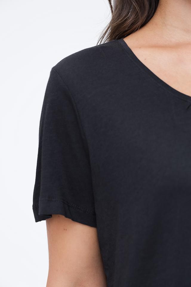 Особенностью данной модели является аккуратный вырез с небольшой декоративной деталью, который придаёт футболке более женственный и утончённый вид. Прямой крой футболки позволяет легко сочетать её с различными элементами одежды — от джинсов и брюк до юбок и шорт.