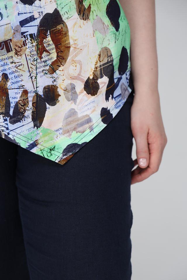 Футболка имеет прямой крой и короткие рукава. Главная особенность модели – эффектный принт, сочетающий в себе леопардовые пятна и элементы газетного текста на зеленом фоне. Асимметричный подол добавляет оригинальности силуэту.