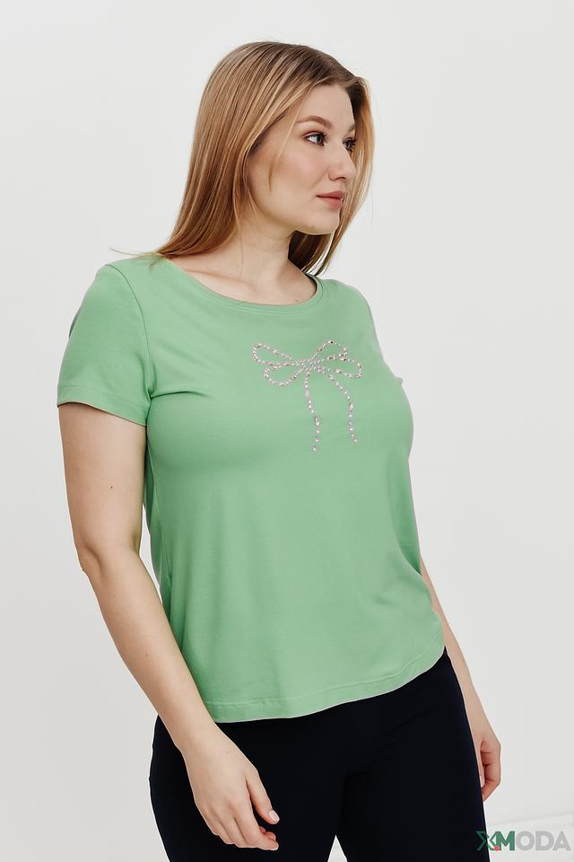 Особый акцент в этой модели – декоративный бант, выполненный из мерцающих страз. Он придает футболке изысканность и делает ее подходящей для особых случаев. Состав ткани: 93% вискоза, 7% эластан.