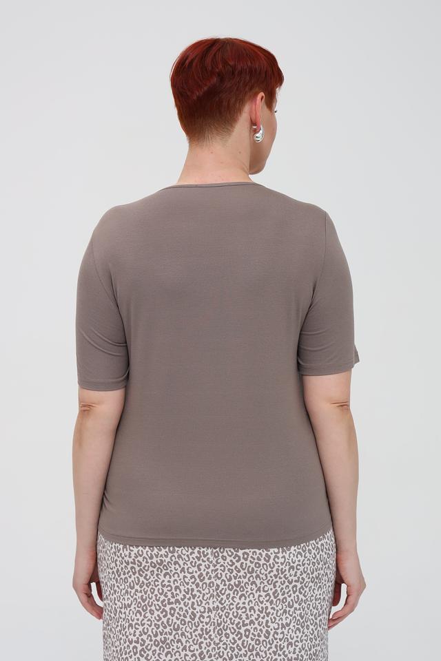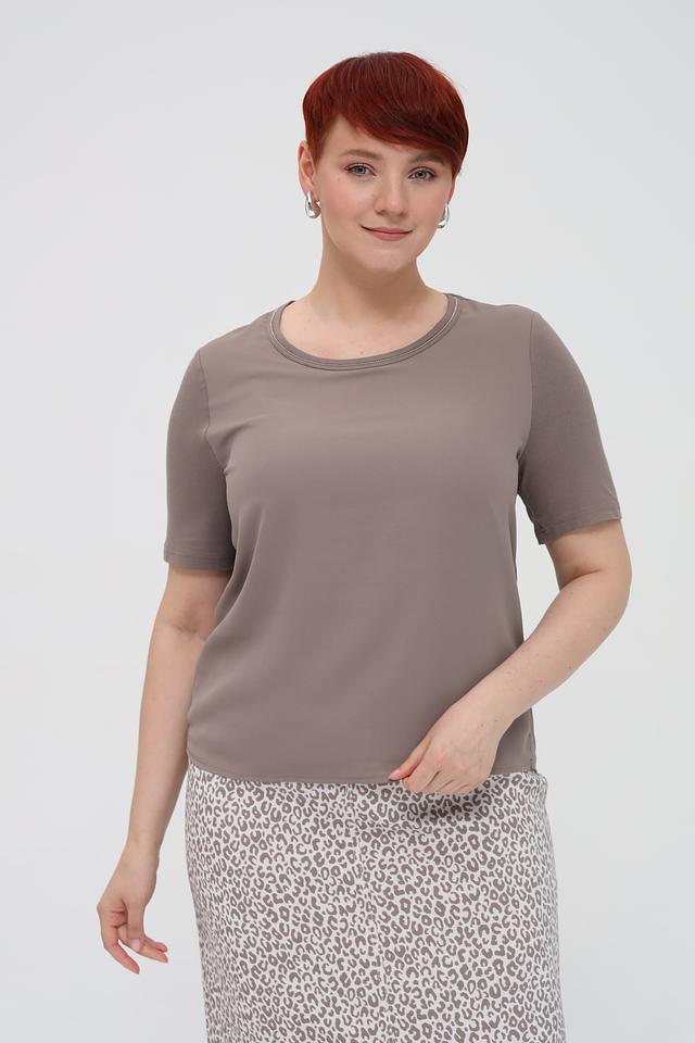 Особенностью данной модели является деликатная отделка горловины тонкой тесьмой, которая добавляет изысканности простому дизайну. Благодаря своему универсальному серому цвету, эта футболка легко сочетается с различными элементами гардероба – от джинсов и юбок до брюк и жакетов.