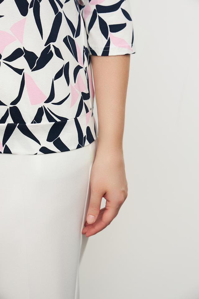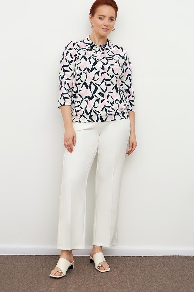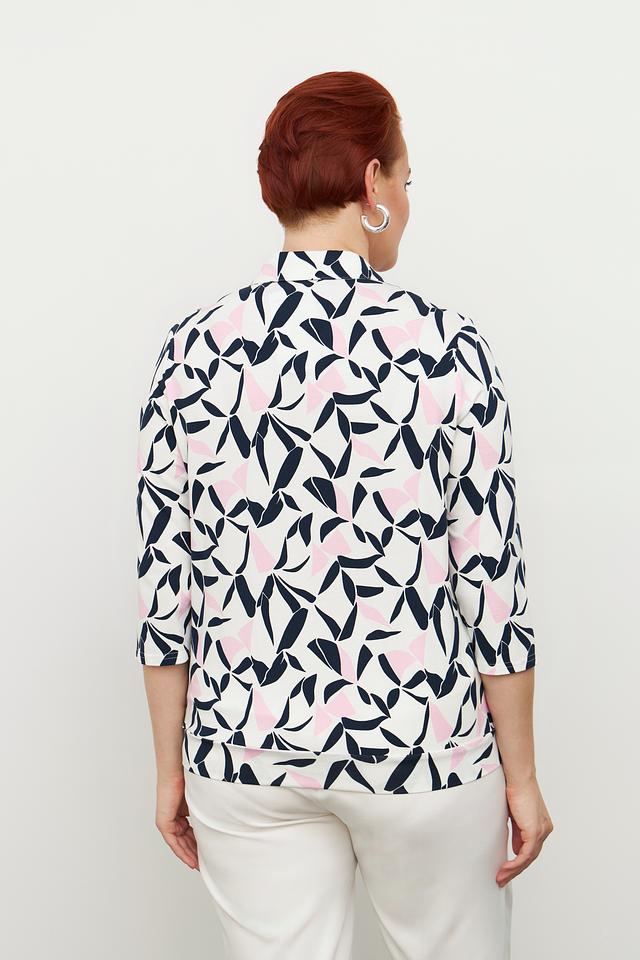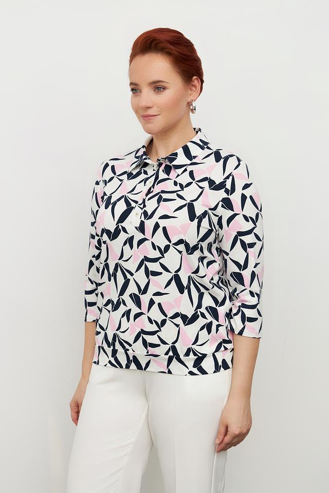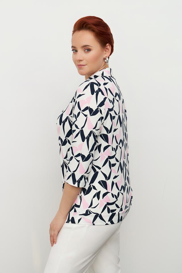 Блузка имеет оригинальный принт с изображением абстрактных цветов в нежных оттенках розового и тёмно-синего на белом фоне. Воротник-стойка придает образу элегантность и изысканность. Рукава длиной 3/4 делают эту модель универсальной для любого времени года.