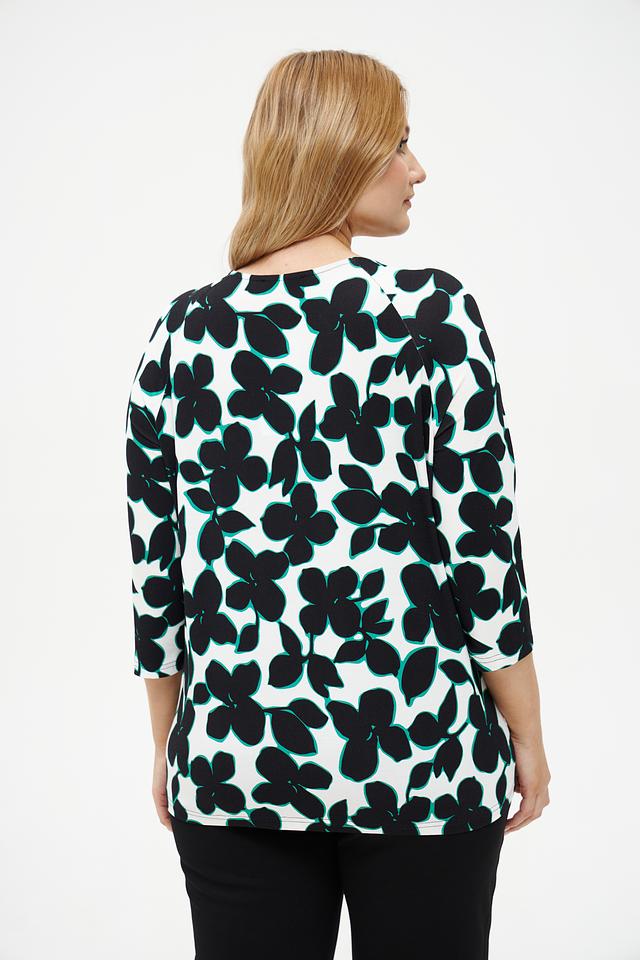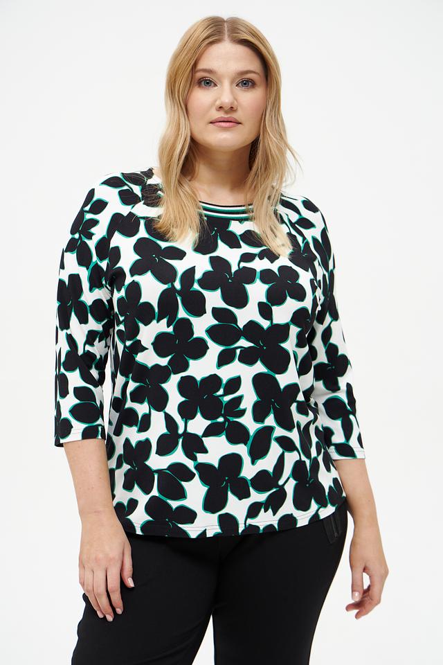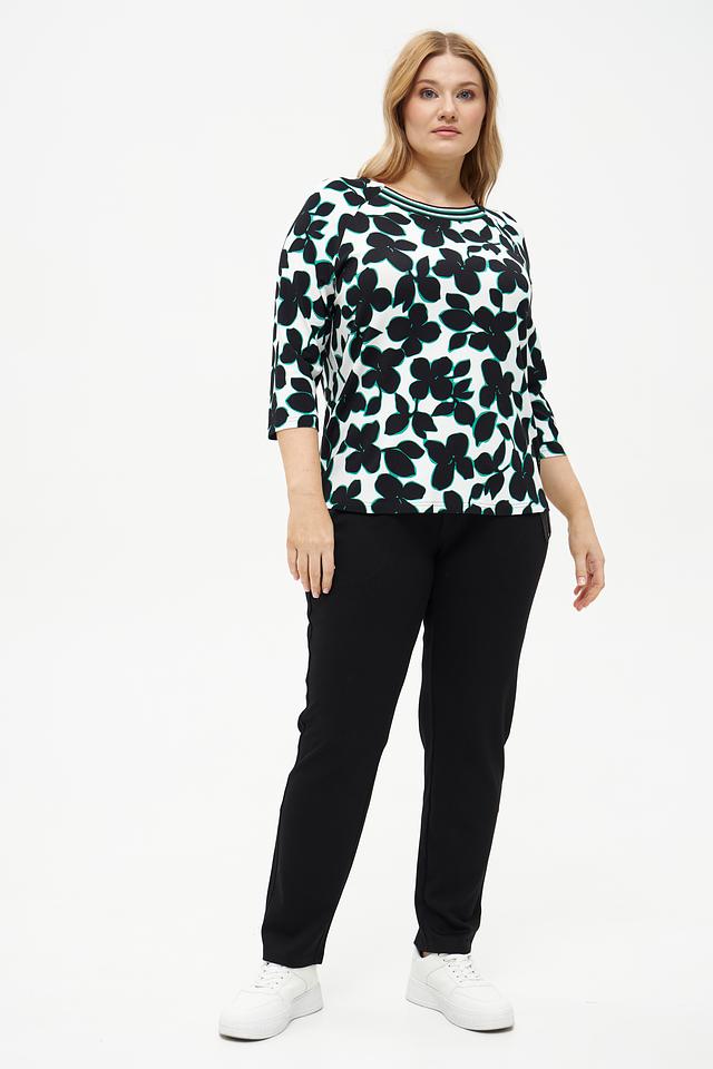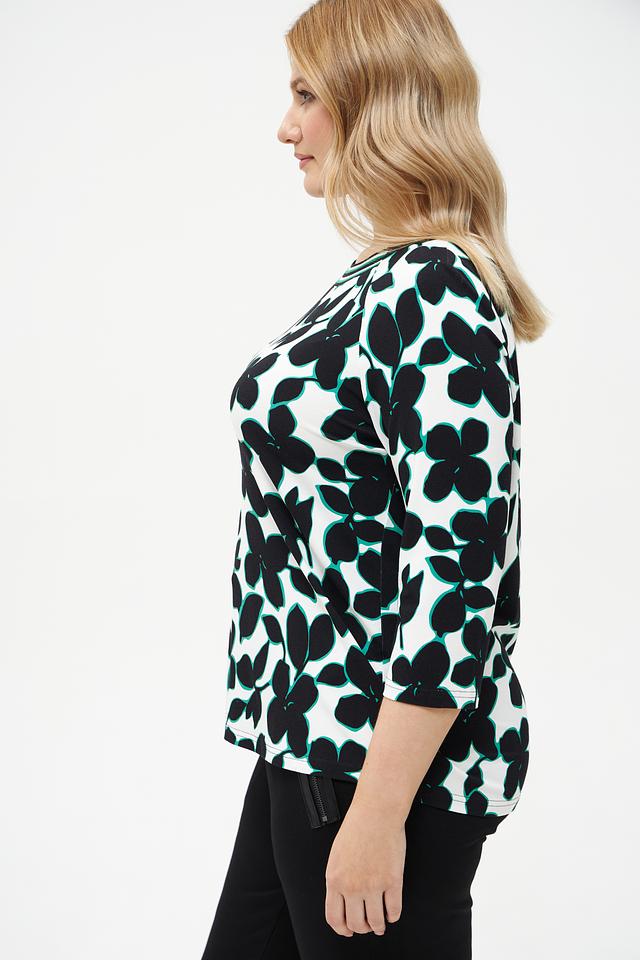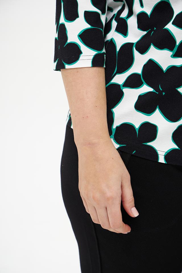 Основной цвет футболки – белый, а яркий принт в виде крупных черных и бирюзовых цветов придает ей оригинальность и выразительность. Рукав 3/4 делает модель универсальной и подходящей для любого времени года.