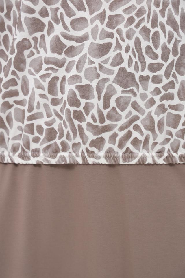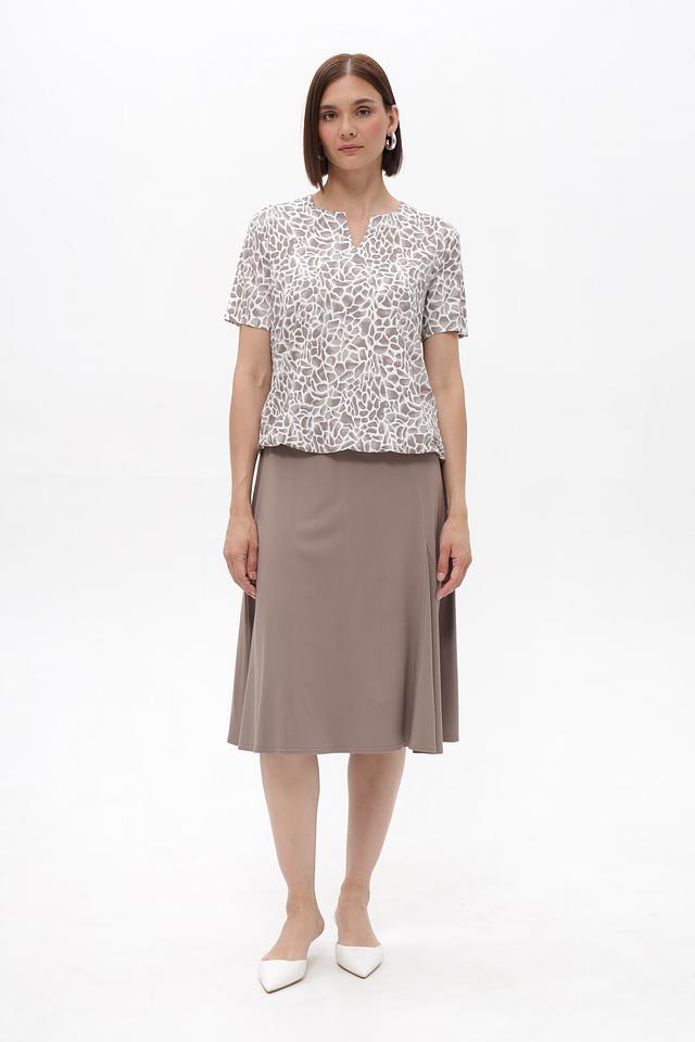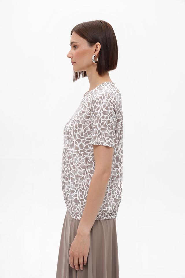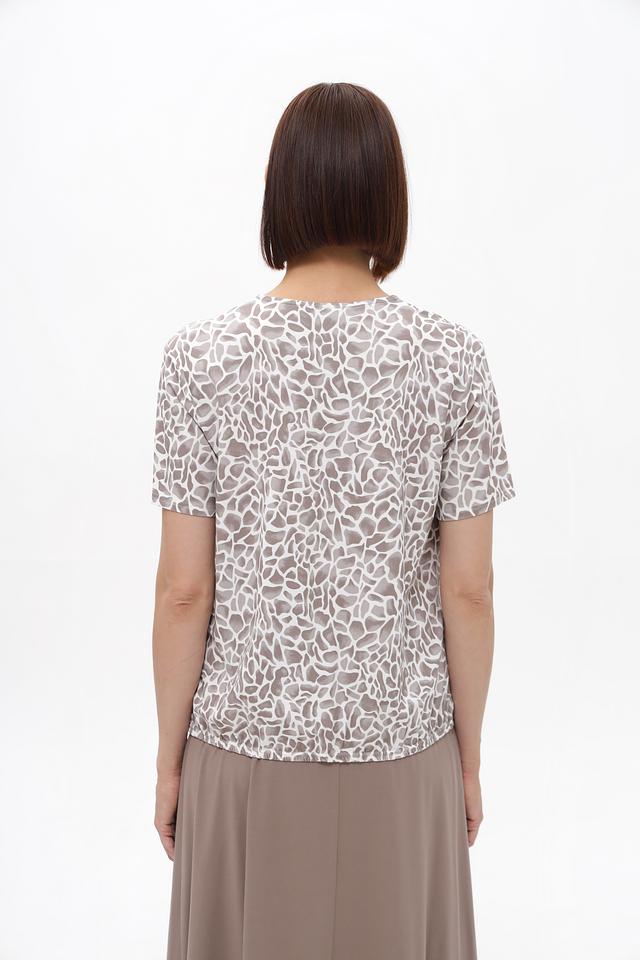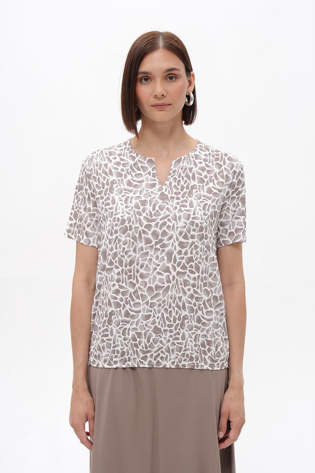 Особенностью данной модели является оригинальный абстрактный принт, который придает ей неповторимый вид. V-образный вырез горловины и короткие рукава делают футболку идеальной для теплой погоды.