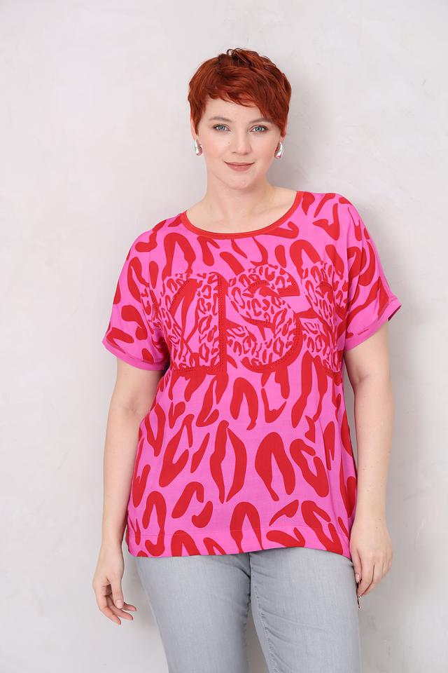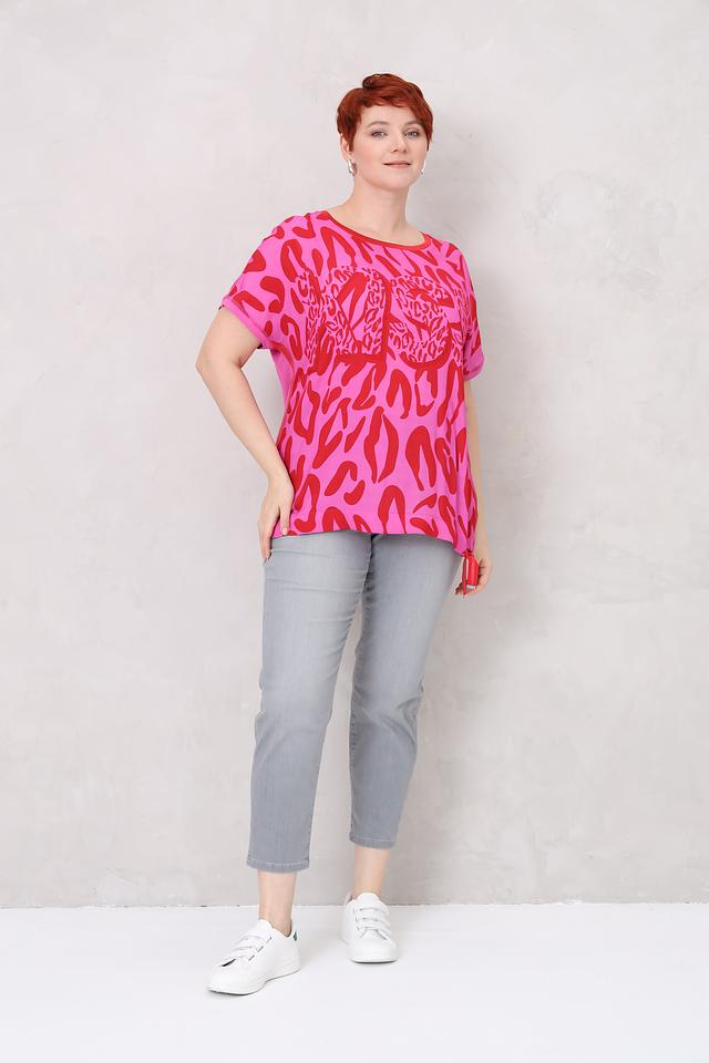 Женская футболка Frapp ярко-розового цвета с оригинальным принтом в виде губ. Модель свободного кроя с короткими рукавами выполнена из мягкой вискозы с добавлением эластана для комфорта и лучшей посадки. Состав: вискоза 90%, эластан 10%