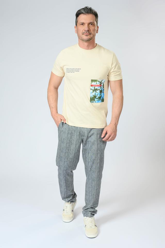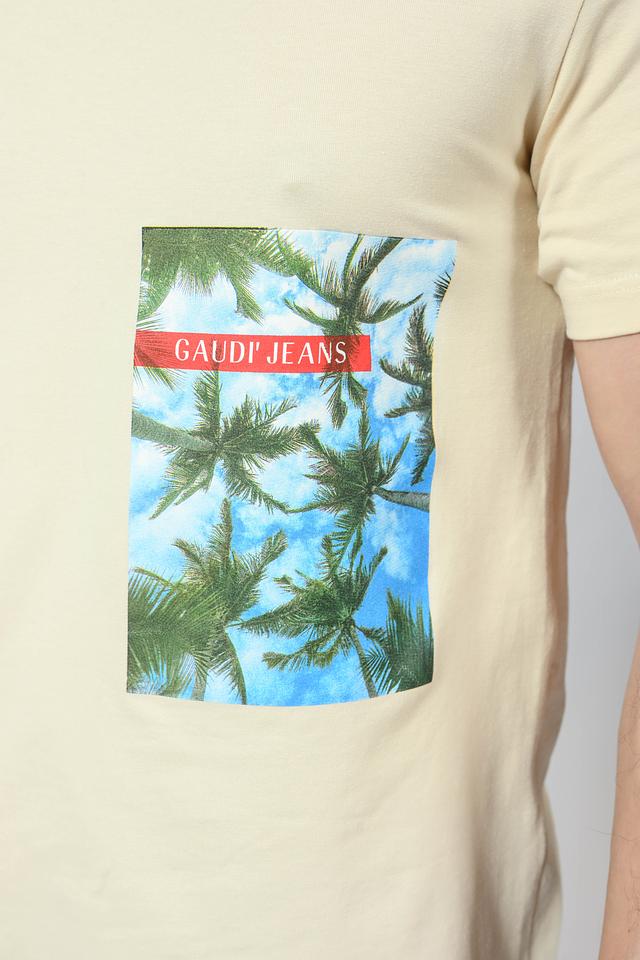 Мужская футболка Gaudi бежевого цвета с ярким принтом в виде пальм. Изготовлена из мягкого хлопка с добавлением эластана для комфорта и лучшей посадки. Стильный и удобный вариант для повседневного образа. Состав: хлопок 95%, эластан 5%