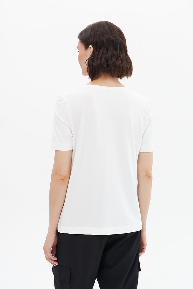 Модель имеет прямой крой, короткие рукава и круглый вырез горловины. Футболка изготовлена из высококачественного материала, состоящего из 47% хлопка, 47% модала и 6% эластана. Такое сочетание обеспечивает комфорт при носке, хорошую воздухопроницаемость и сохранение формы.