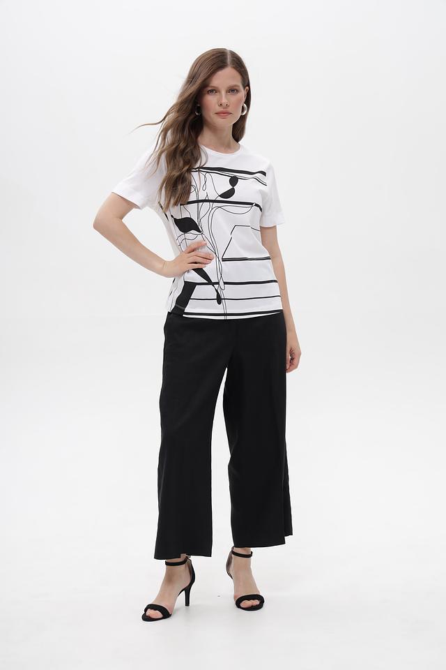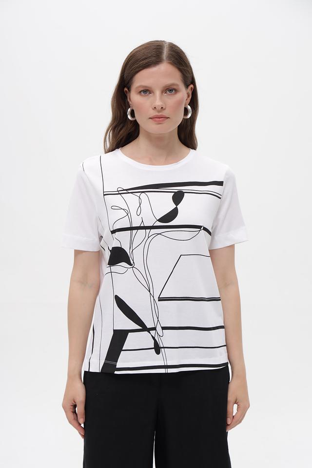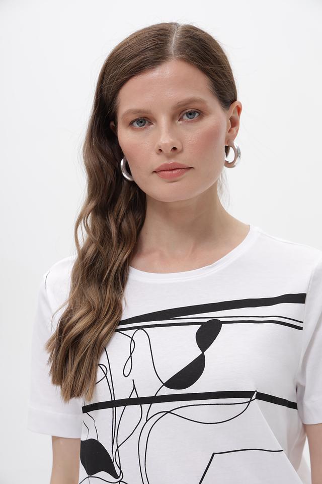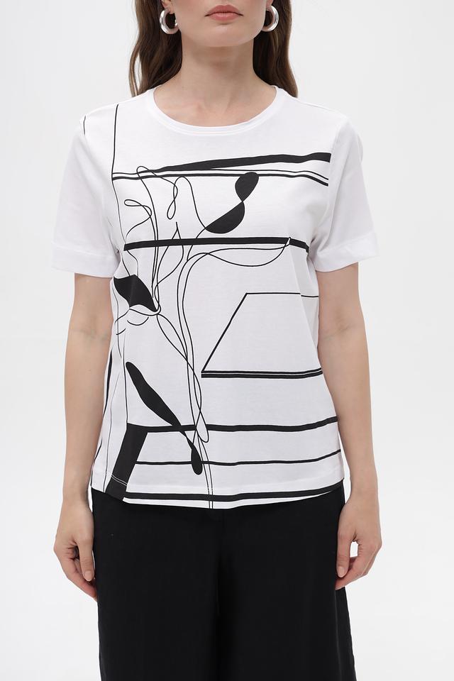 Белая футболка Gerry Weber с оригинальным чёрно-белым принтом. Изготовлена из 100% хлопка, обеспечивающего комфорт и воздухопроницаемость. Стильный крой и лаконичный дизайн делают эту футболку отличным выбором для повседневного образа. Состав: хлопок 100%