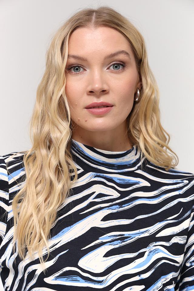 Футболка имеет прямой крой и удобный воротник-стойка. Главная особенность модели – эффектный абстрактный принт в синих, белых и черных тонах, который придаёт ей современный и динамичный вид. Принт выполнен в виде размытых мазков, напоминающих мраморные разводы.