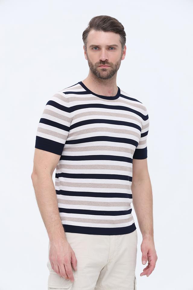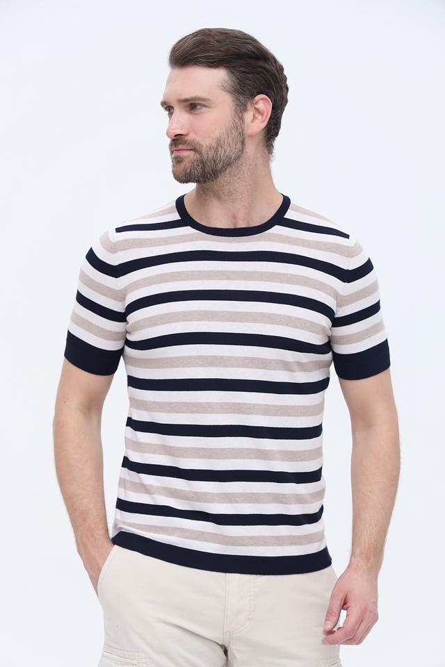 Футболка имеет круглый вырез горловины и короткие рукава. Цветовая гамма представлена в сочетании синего и бежевого, что придает ей элегантный и современный вид. Эта модель станет незаменимой частью вашего повседневного гардероба, обеспечивая комфорт и стиль в любой ситуации.