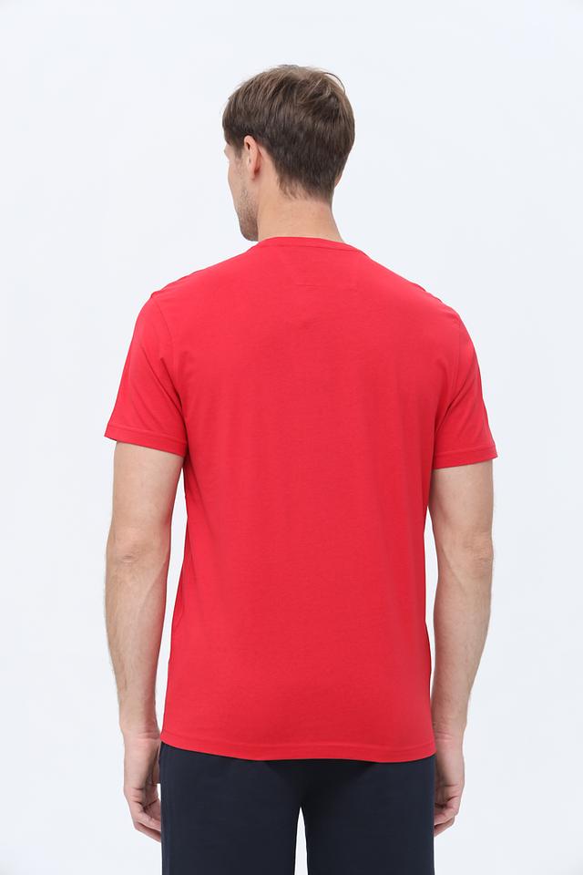 Основной цвет футболки – насыщенный красный. На передней части изделия расположен яркий принт "Sails", выполненный в сочетании красного, белого и синего цветов. Принт добавляет футболке динамичный и современный вид.