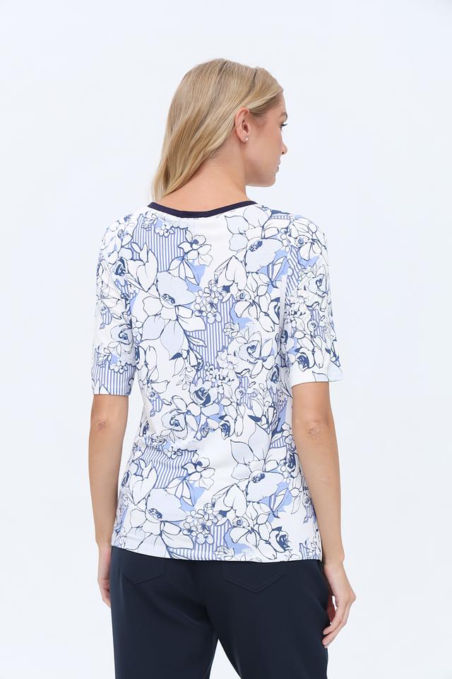 Основной цвет футболки – белый, украшен ярким цветочным принтом в голубых и синих тонах. Принт добавляет образу женственности и легкости. Круглый вырез горловины и короткие рукава делают футболку универсальной и подходящей для различных случаев.