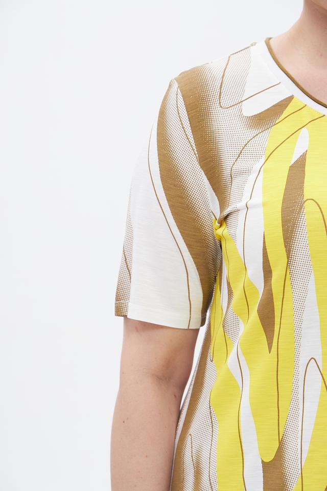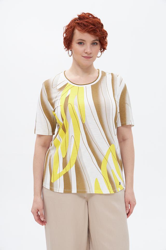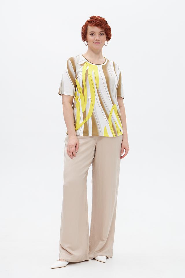 Основной цвет футболки — бежевый, но ярким акцентом является абстрактный принт, сочетающий в себе жёлтые и белые оттенки. Принт выполнен в виде плавных, изогнутых линий, придающих изделию оригинальность и современный вид.