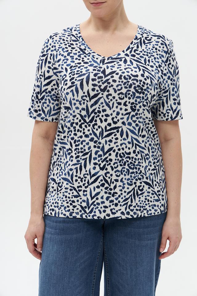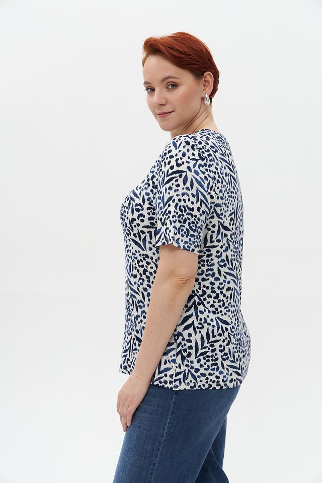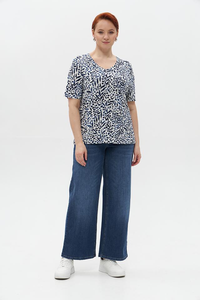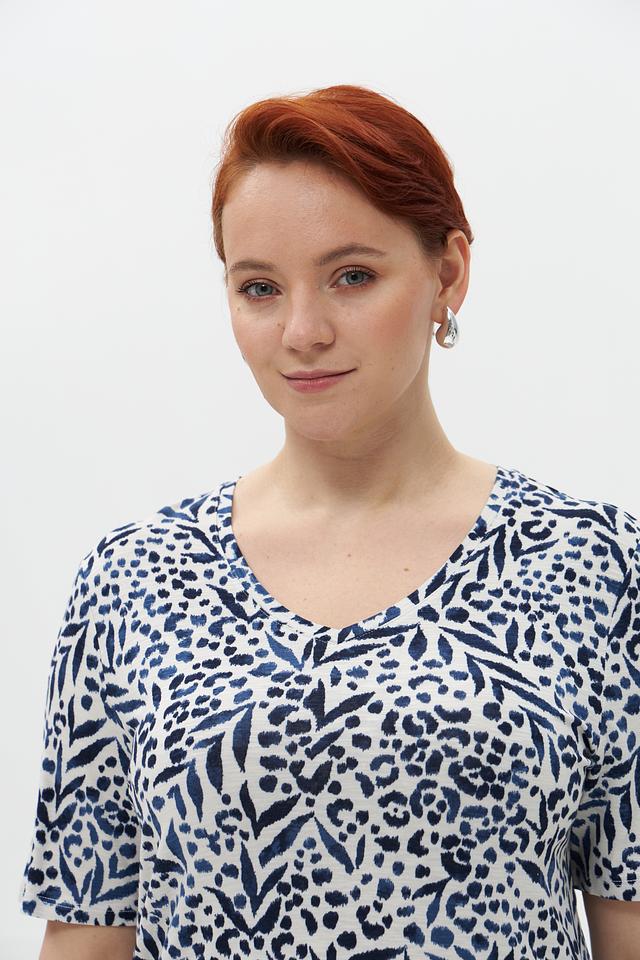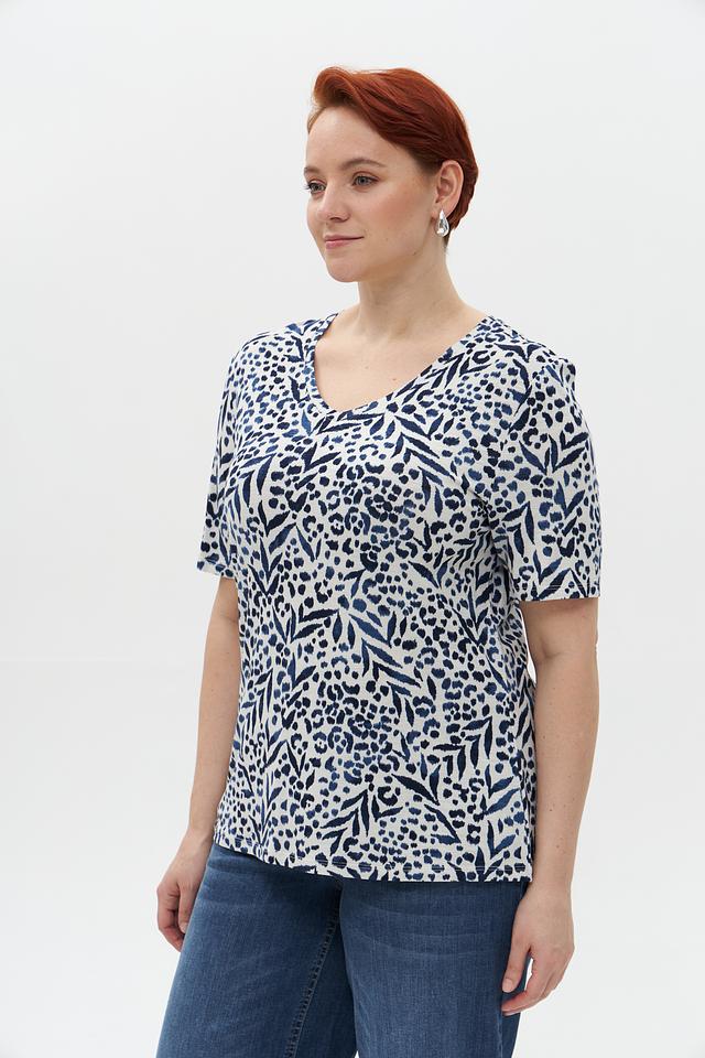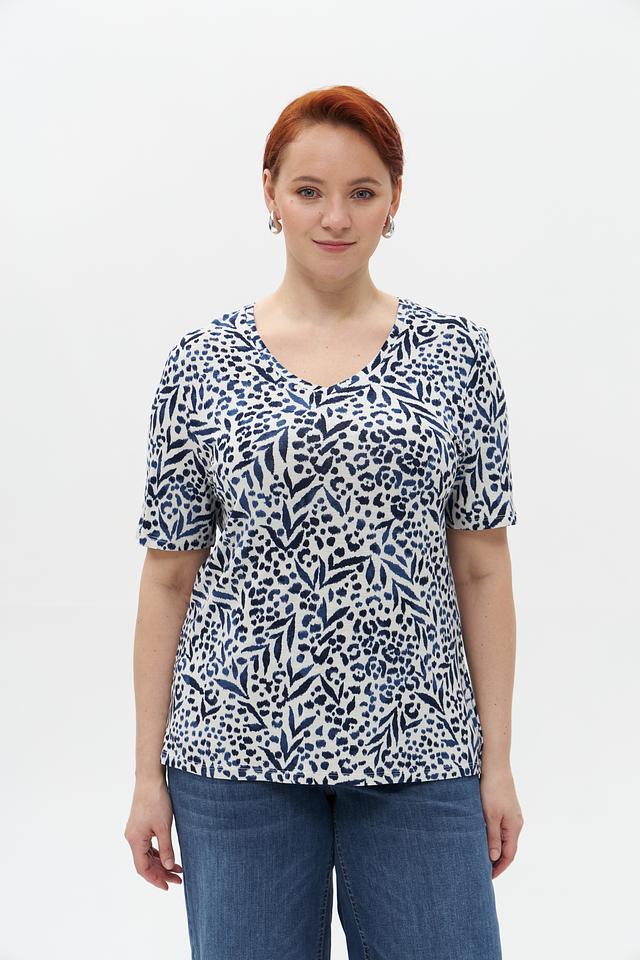 Основной цвет футболки – белый, а ярким акцентом является стильный синий принт с абстрактным растительным рисунком. V-образный вырез горловины и короткие рукава делают эту модель универсальной и подходящей для различных случаев.