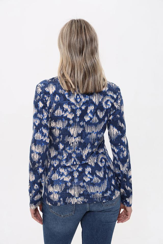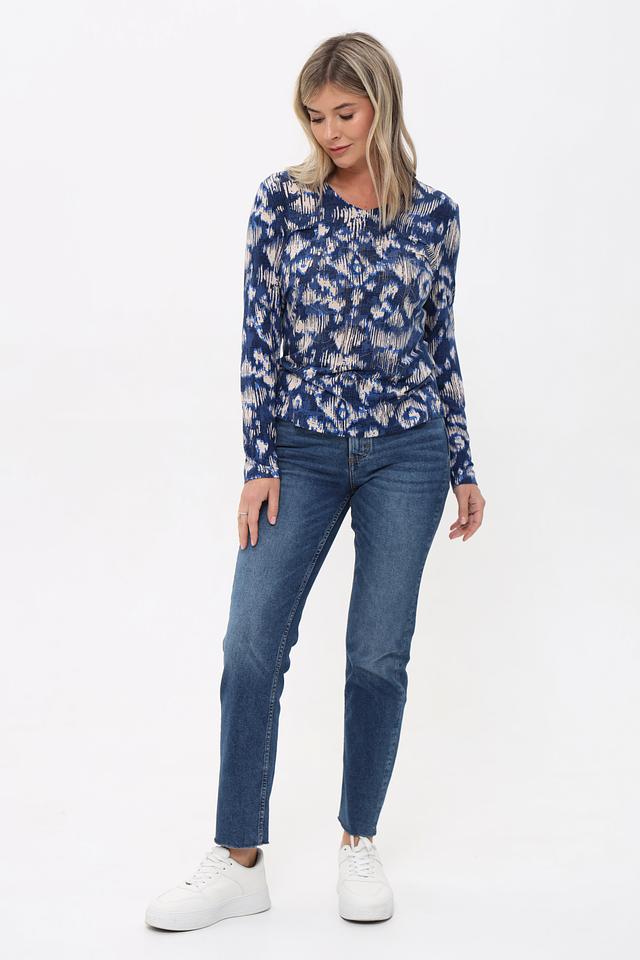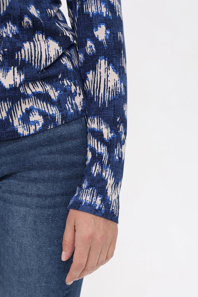 Основной цвет футболки – глубокий синий, украшенный оригинальным абстрактным принтом в белых и светло-синих тонах. Принт придает изделию индивидуальность и делает его интересным акцентом в образе.