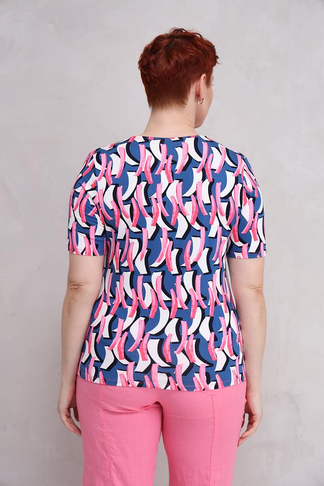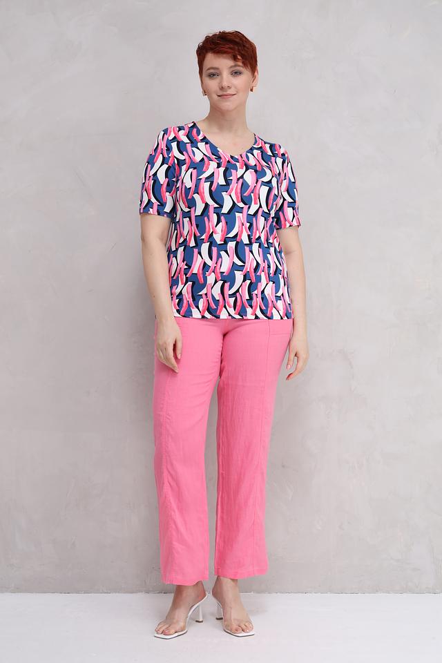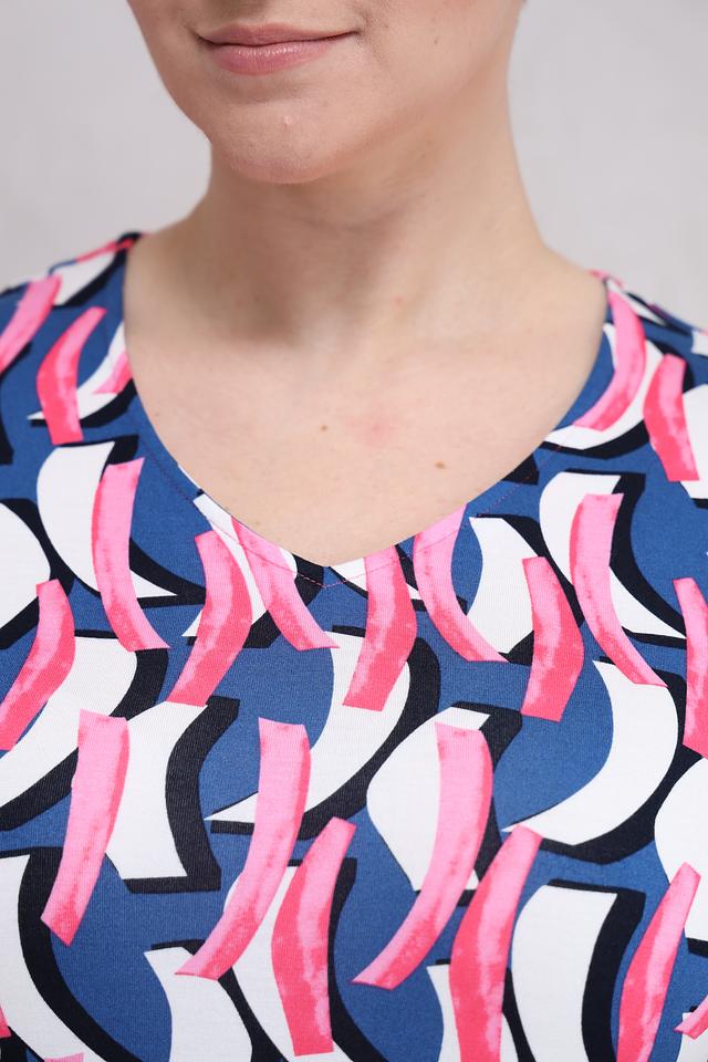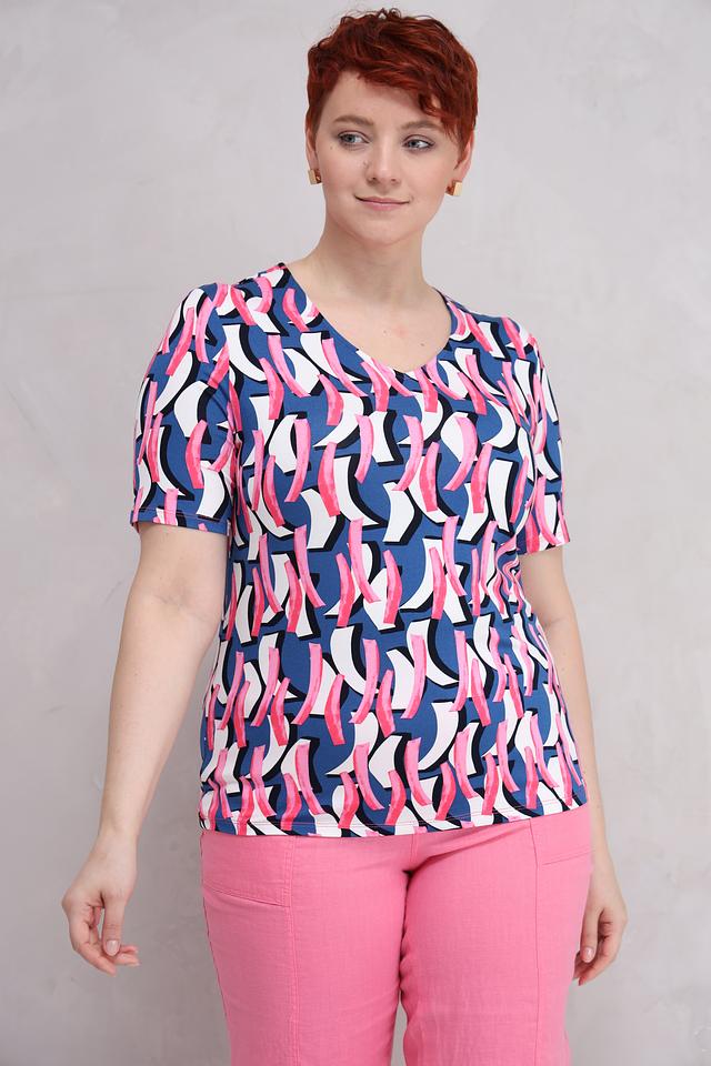 Футболка имеет прямой крой и короткие рукава, что делает ее идеальной для теплой погоды. Главной особенностью модели является яркий и оригинальный принт, выполненный в абстрактном стиле. Сочетание синего фона с розовыми и белыми элементами создает эффектный и запоминающийся образ.