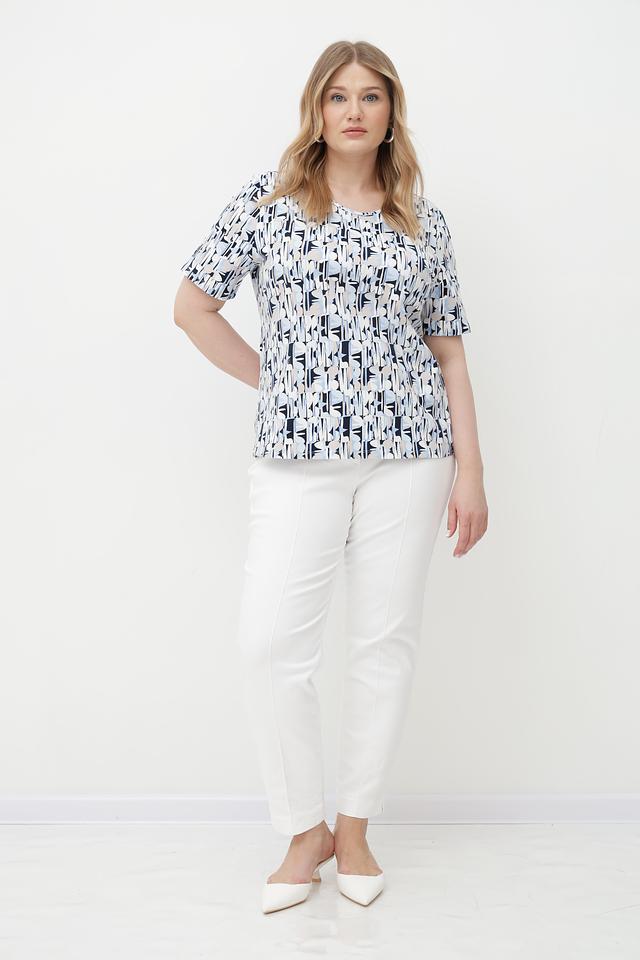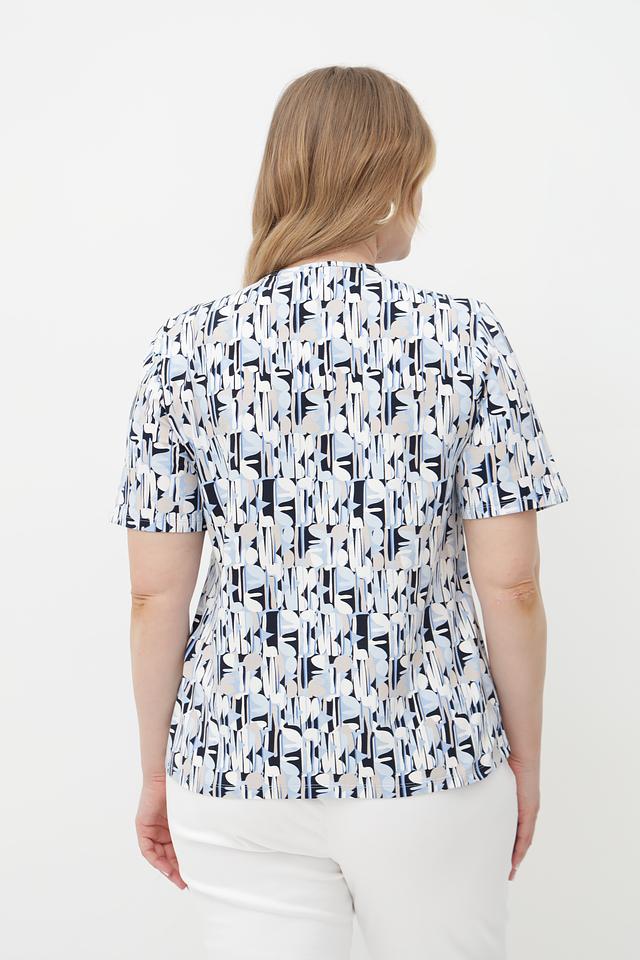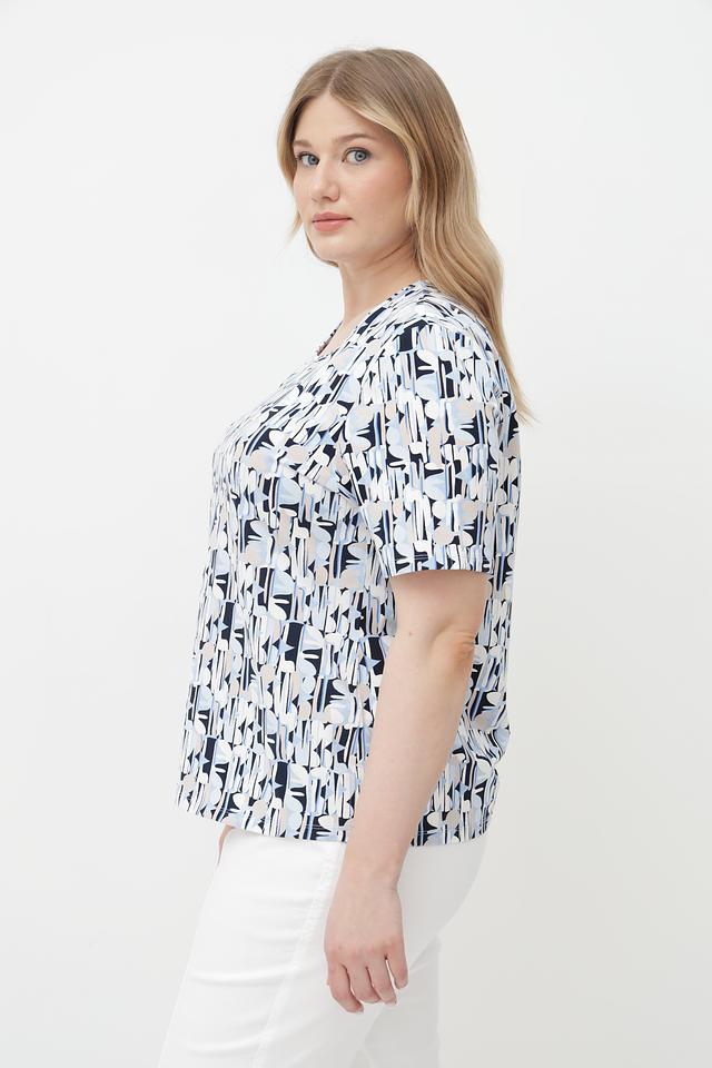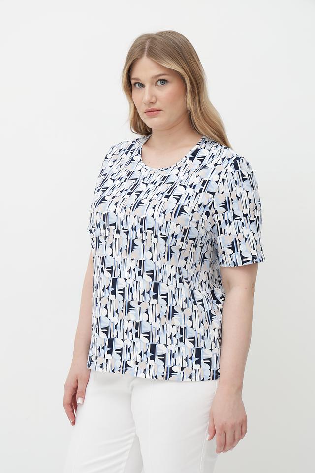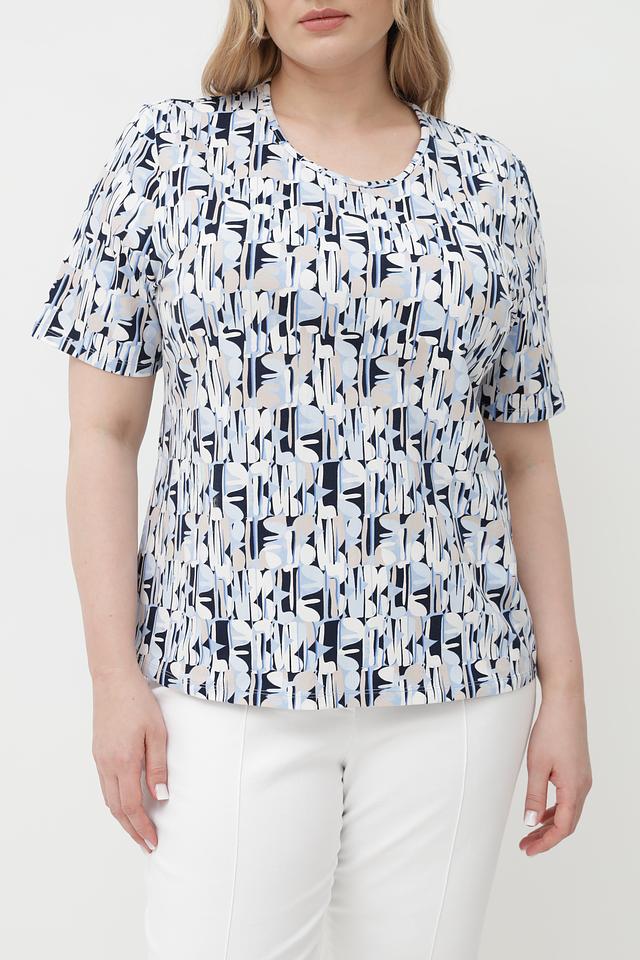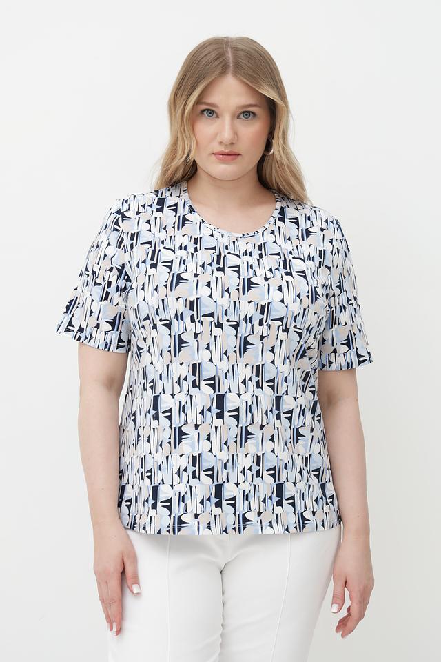 Футболка имеет прямой крой и короткие рукава, что делает ее идеальной для повседневной носки. Главной особенностью модели является яркий и необычный геометрический принт, выполненный в голубых и белых тонах. Этот принт добавит вашему образу оригинальности и индивидуальности.