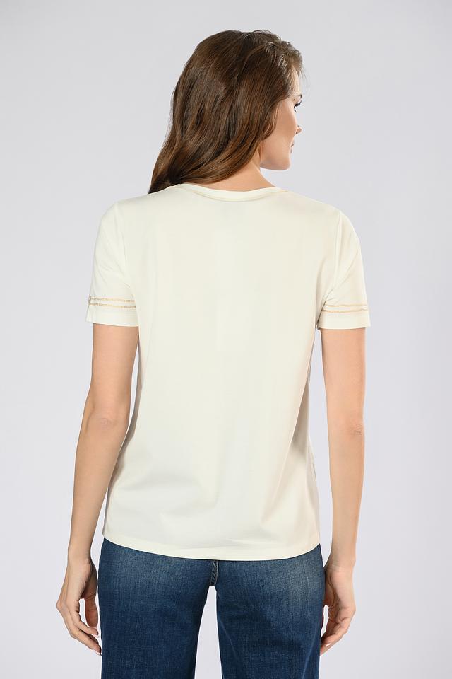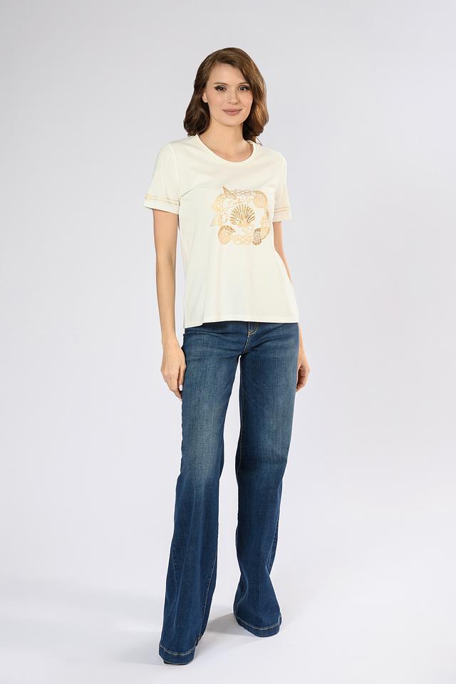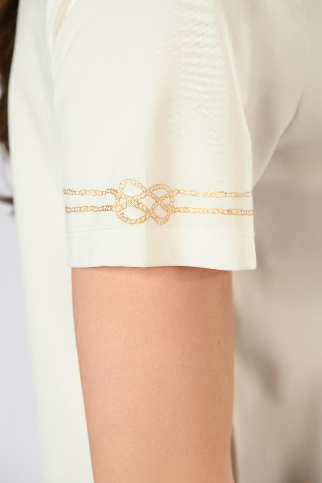 Модель имеет классический крой с короткими рукавами и круглым вырезом горловины. Рукава отделаны тонкой золотистой тесьмой, что добавляет образу изысканности. Футболка выполнена из приятной к телу ткани, сочетающей в себе 63% вискозы и 37% полиамида, что обеспечивает комфорт при носке и хорошую посадку по фигуре.