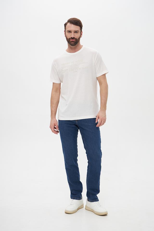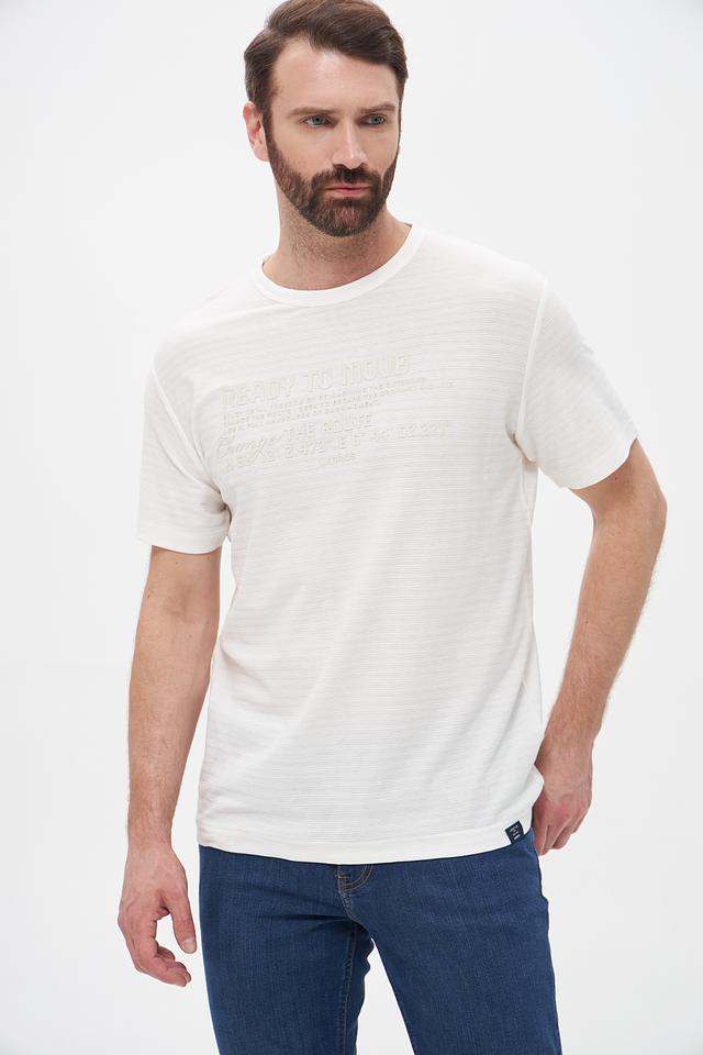 Особенностью данной модели является фактурная текстура ткани и оригинальный принт на груди. Принт выполнен в технике, имитирующей надпись, что придает футболке современный и лаконичный вид.
